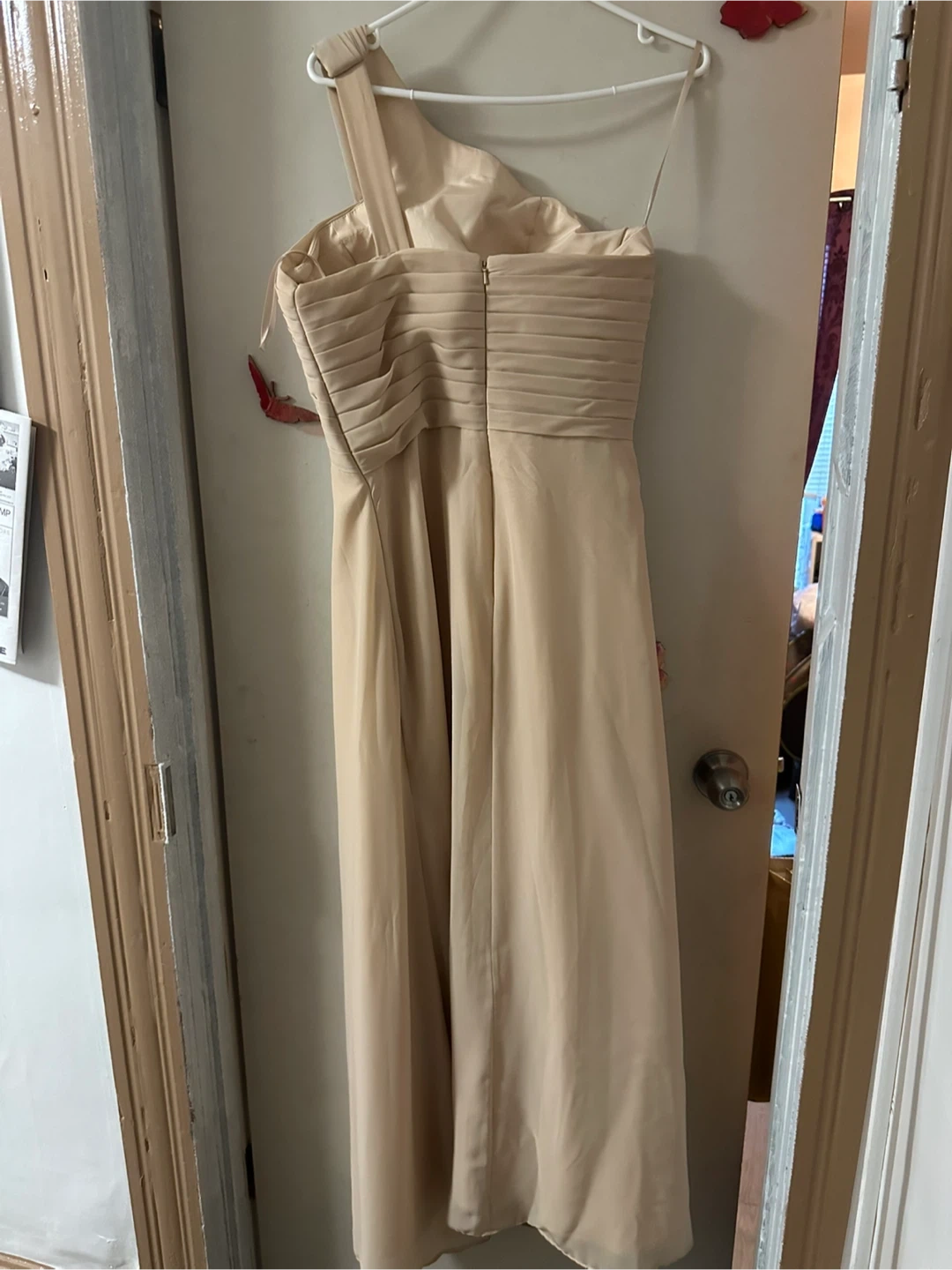 Selling a beautiful beige one-shoulder dress! It features elegant pleating and a decorative bow detail. Perfect for a special occasion or evening out