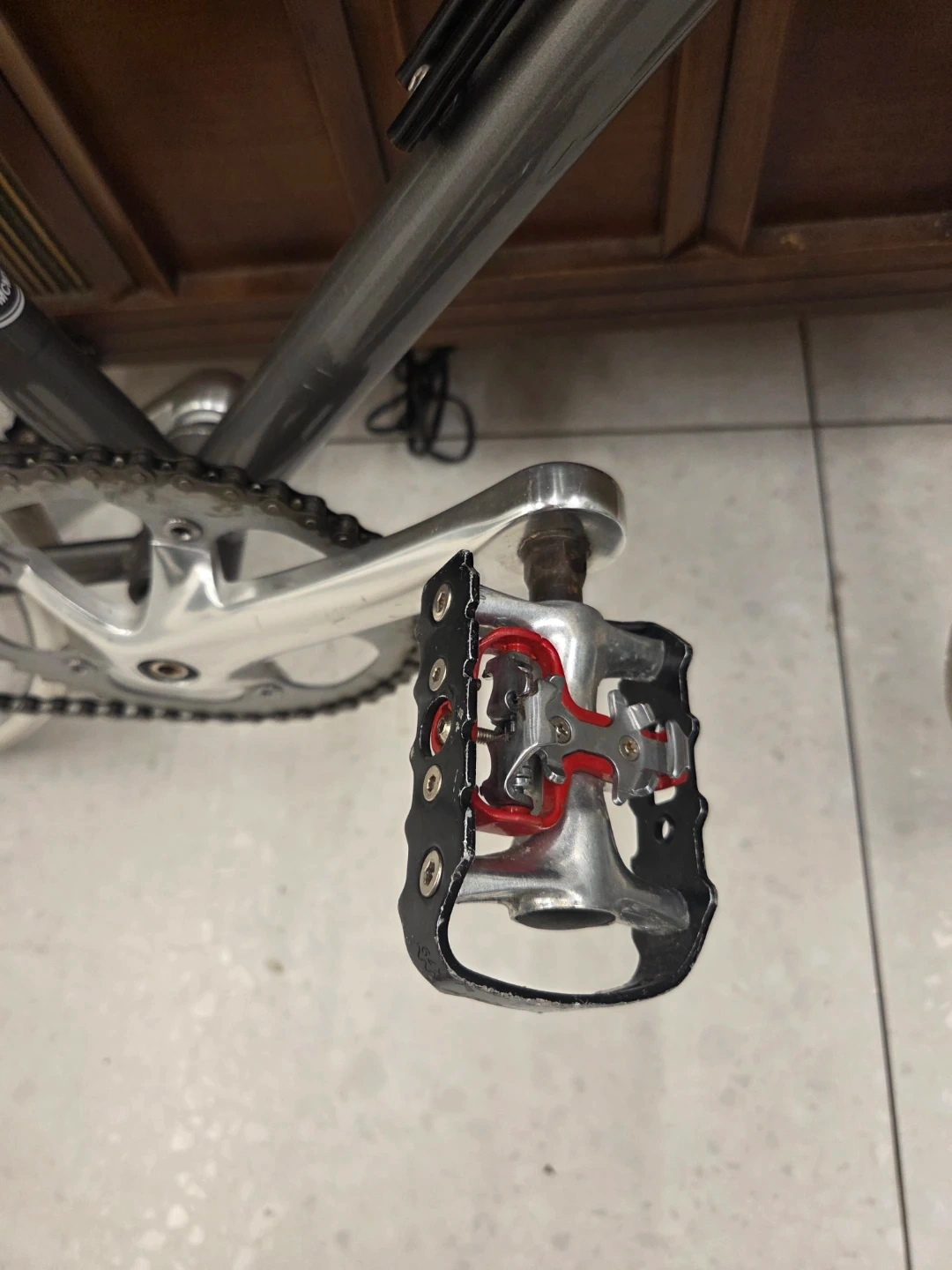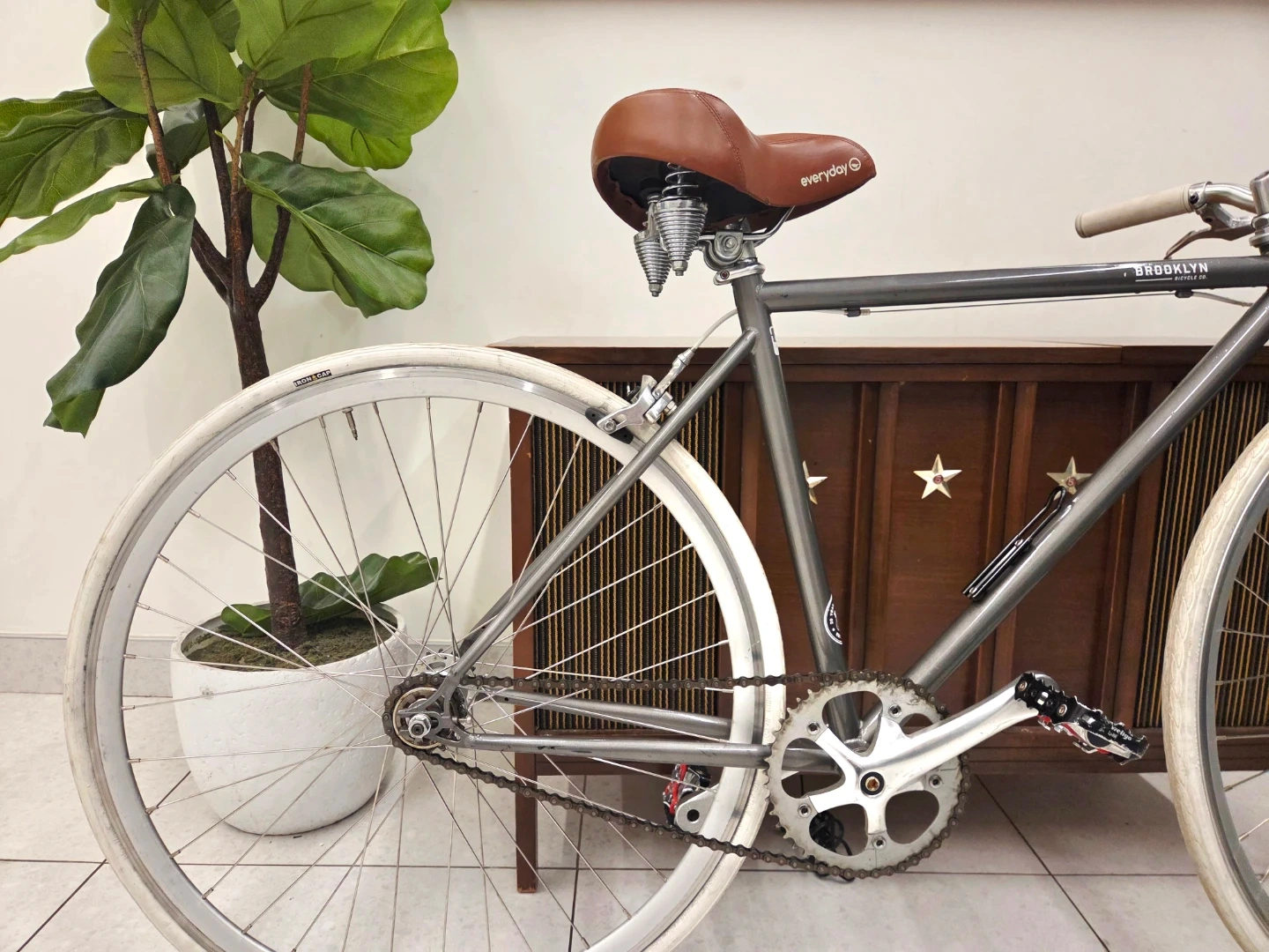The bike is equipped with a flip-flop hub, allowing it to be ridden as either a fixed gear or a single-speed freewheel.
