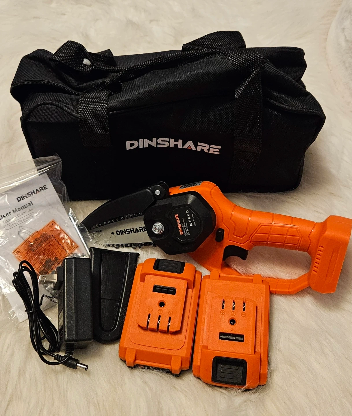 Selling a DINSHARE mini chainsaw. This cordless electric pruning saw is perfect for small jobs around the yard. It comes with two 20V lithium batteries, a charger, extra chains, and a carrying case. Get yours today!