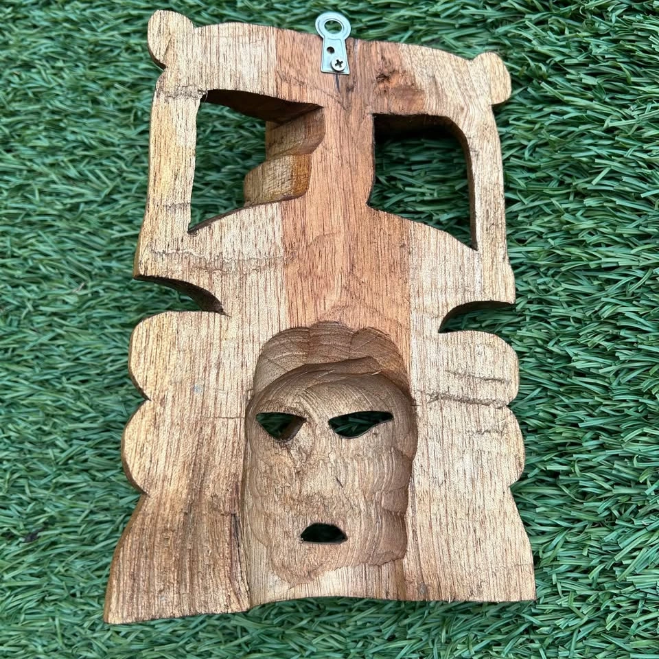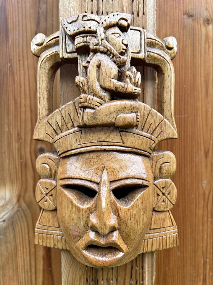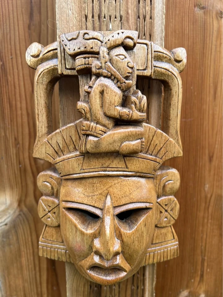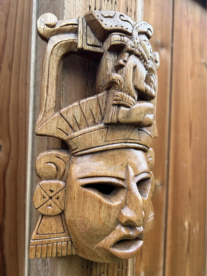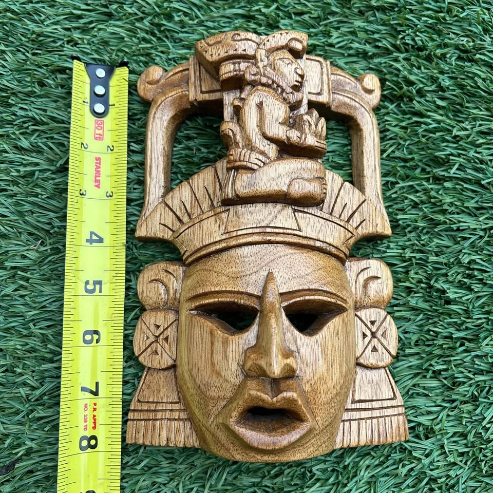 Beautiful hand-carved Mayan-style wooden mask featuring a detailed warrior/figure sitting atop the headdress. Nicely carved from solid wood with rich natural tones and great tribal detailing. A striking decorative piece for boho, rustic, or global-inspired interiors. Ready to hang.