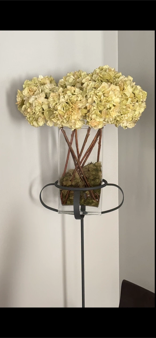 A beautiful floral arrangement in a clear glass vase, complete with decorative branches and moss. It sits on an elegant black metal stand, perfect for adding a touch of nature to your home decor