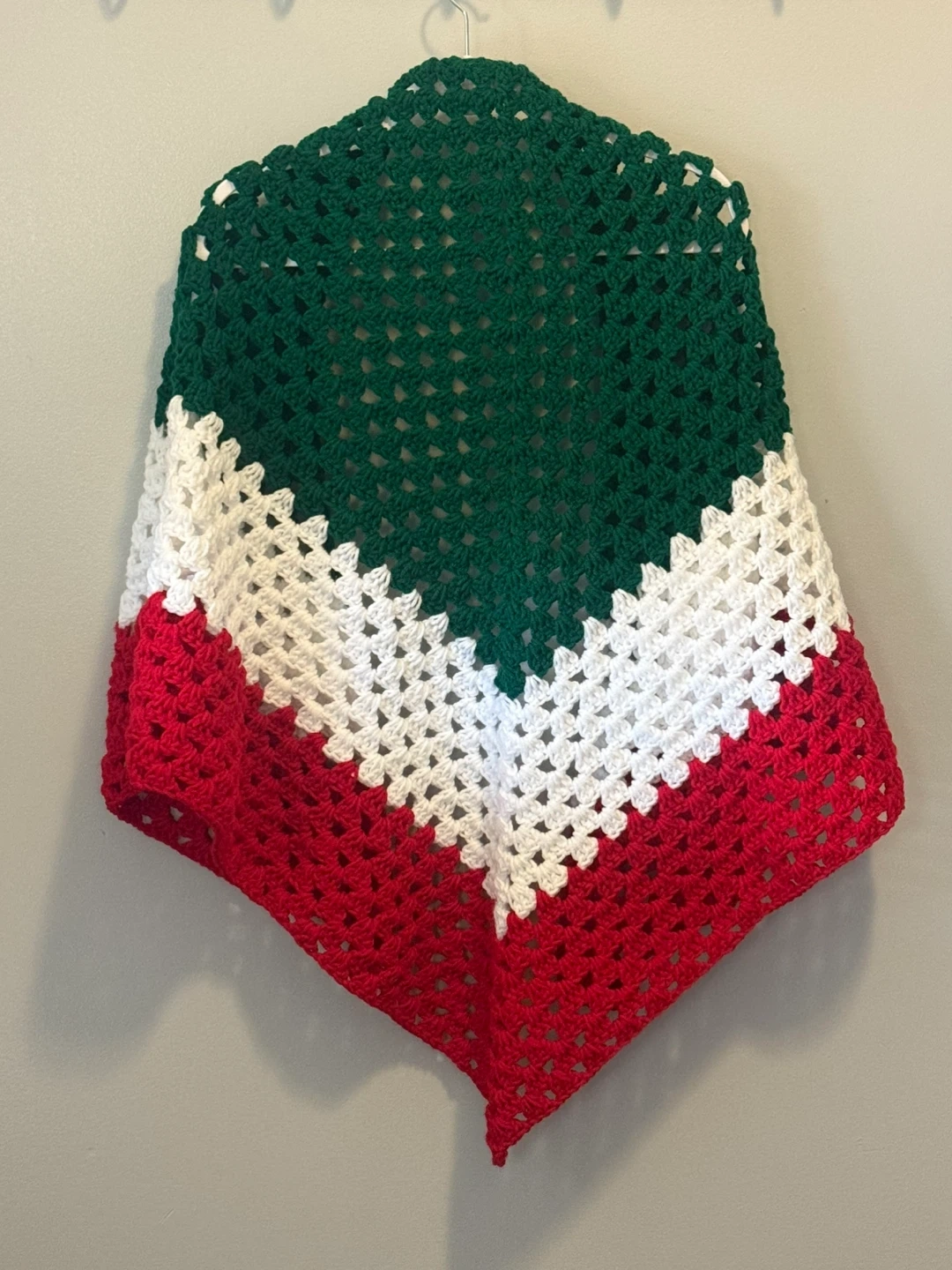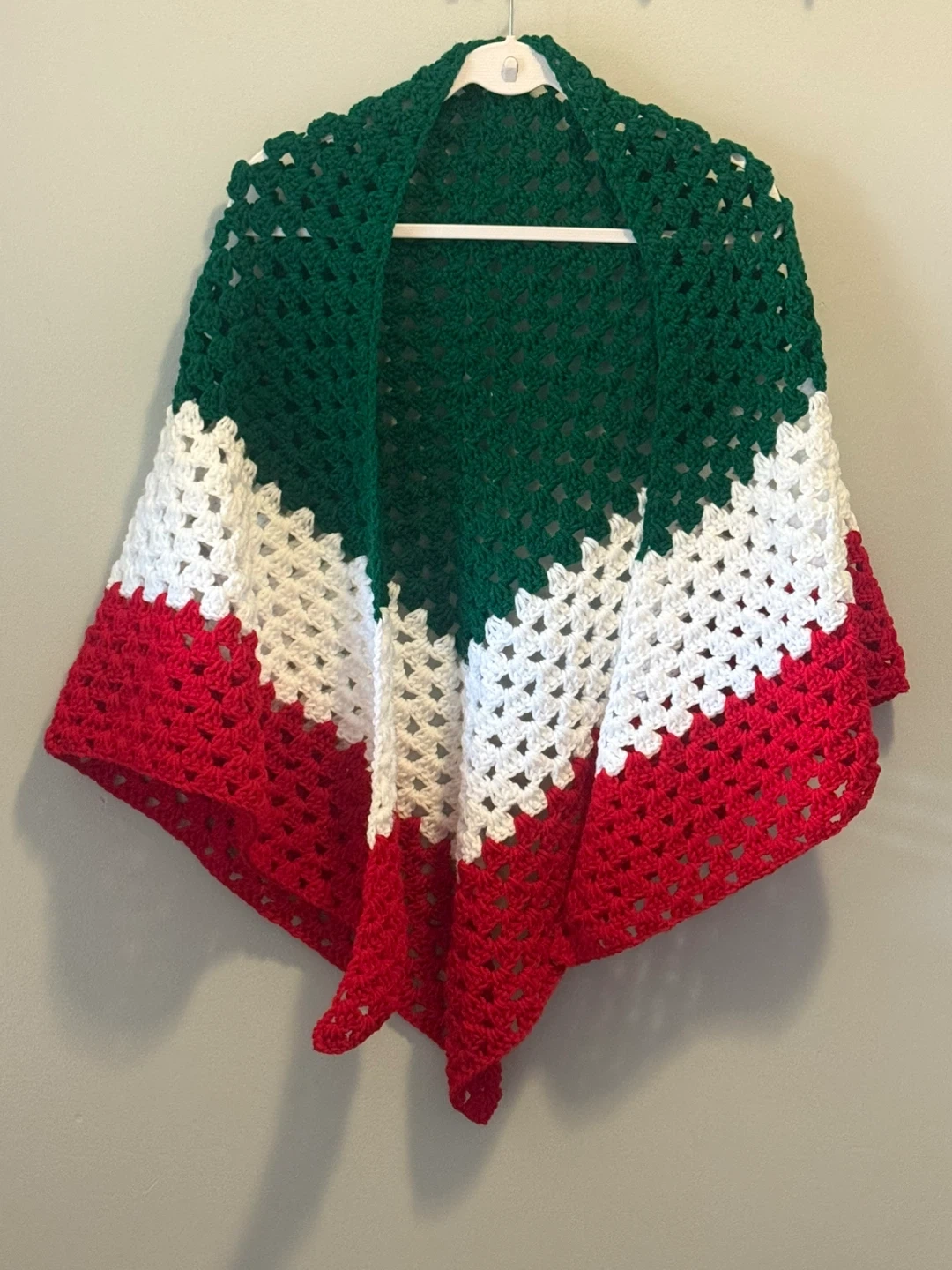 Selling a beautiful handmade crochet shawl. It features a lovely design with green, white, and red colours. Perfect for adding a touch of warmth and style to any outfit!
