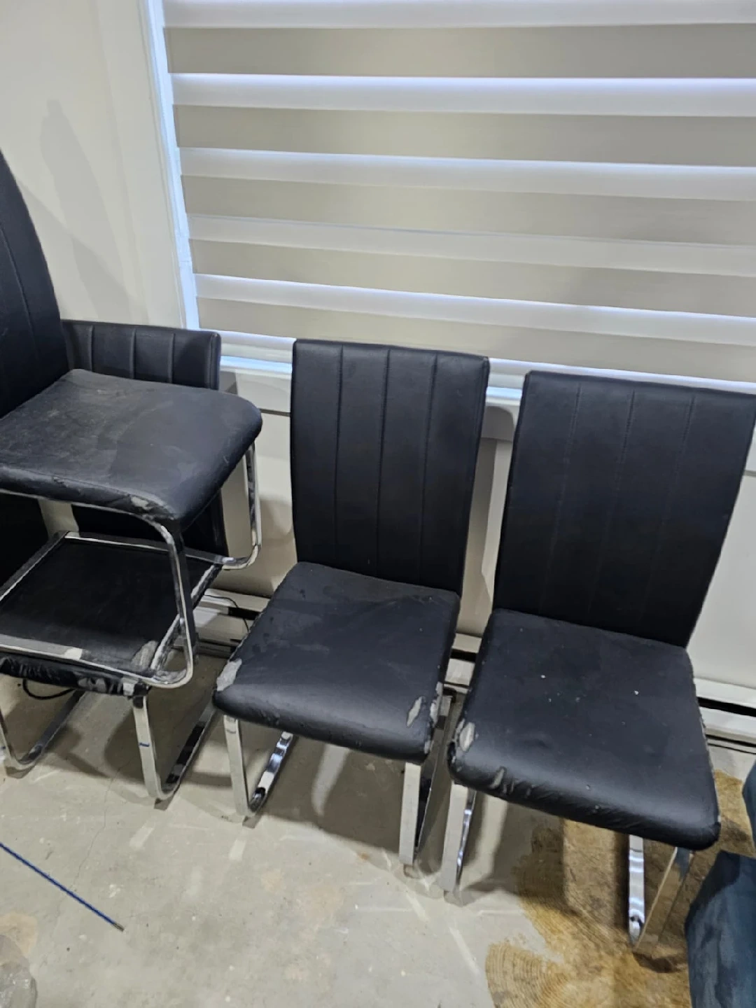 Selling a set of four dining chairs. They are black with chrome legs. There are some signs of wear on the seats.