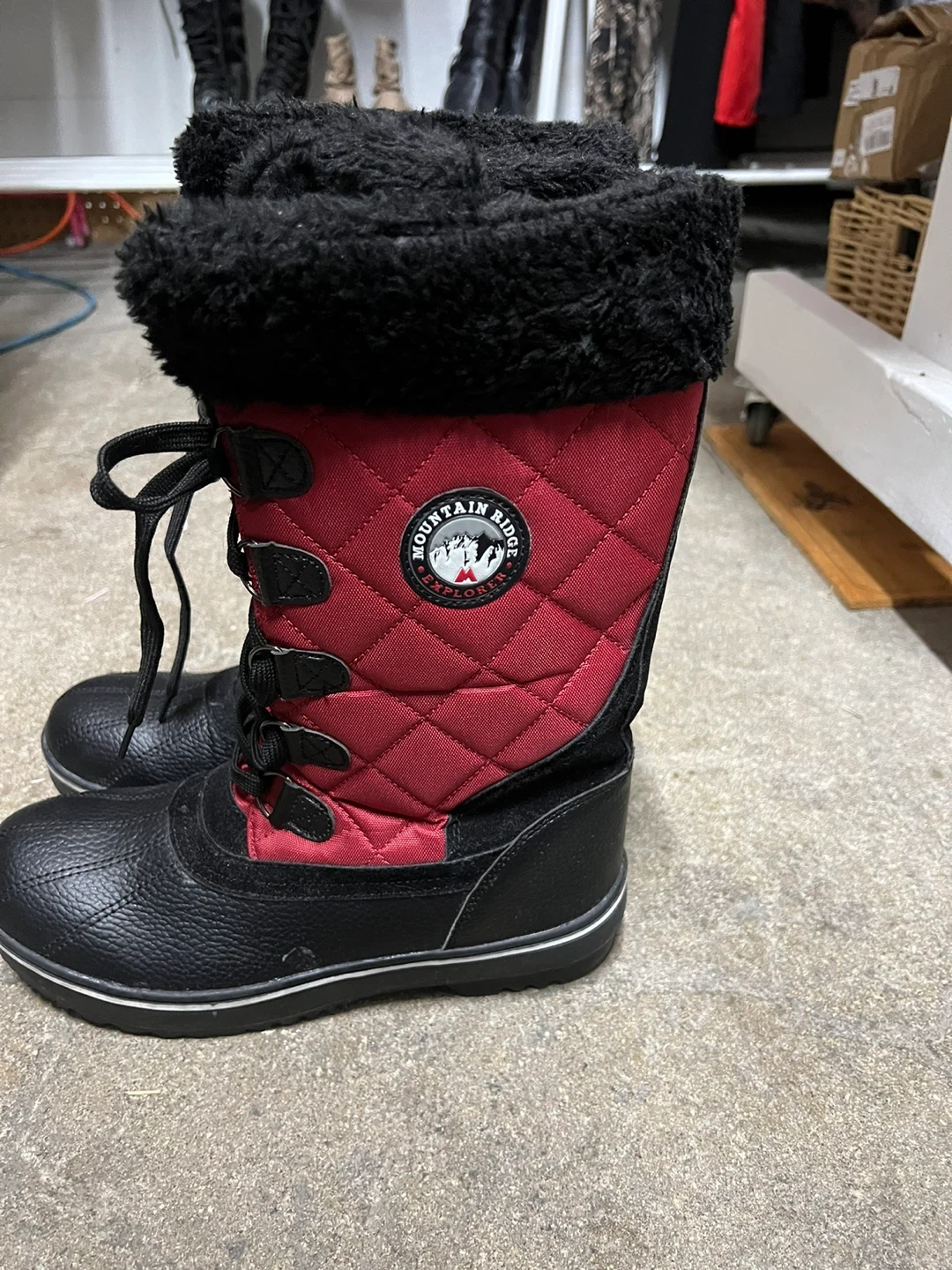 Cozy and stylish winter boots from Mountain Ridge Explorer! These boots are perfect for keeping your feet warm and dry during the cold Canadian winters. They feature a black base with a red quilted upper and a soft, furry black trim. Women's size 10