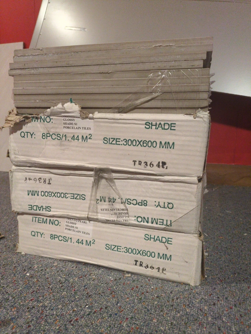 Selling glossy pearl shade porcelain tiles. The size is 300x600 mm. Each box contains 8 pieces / 1.44 m²