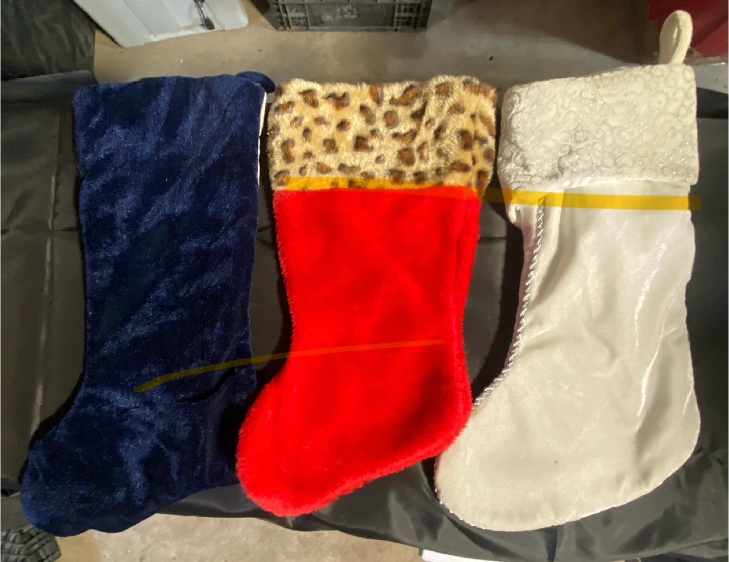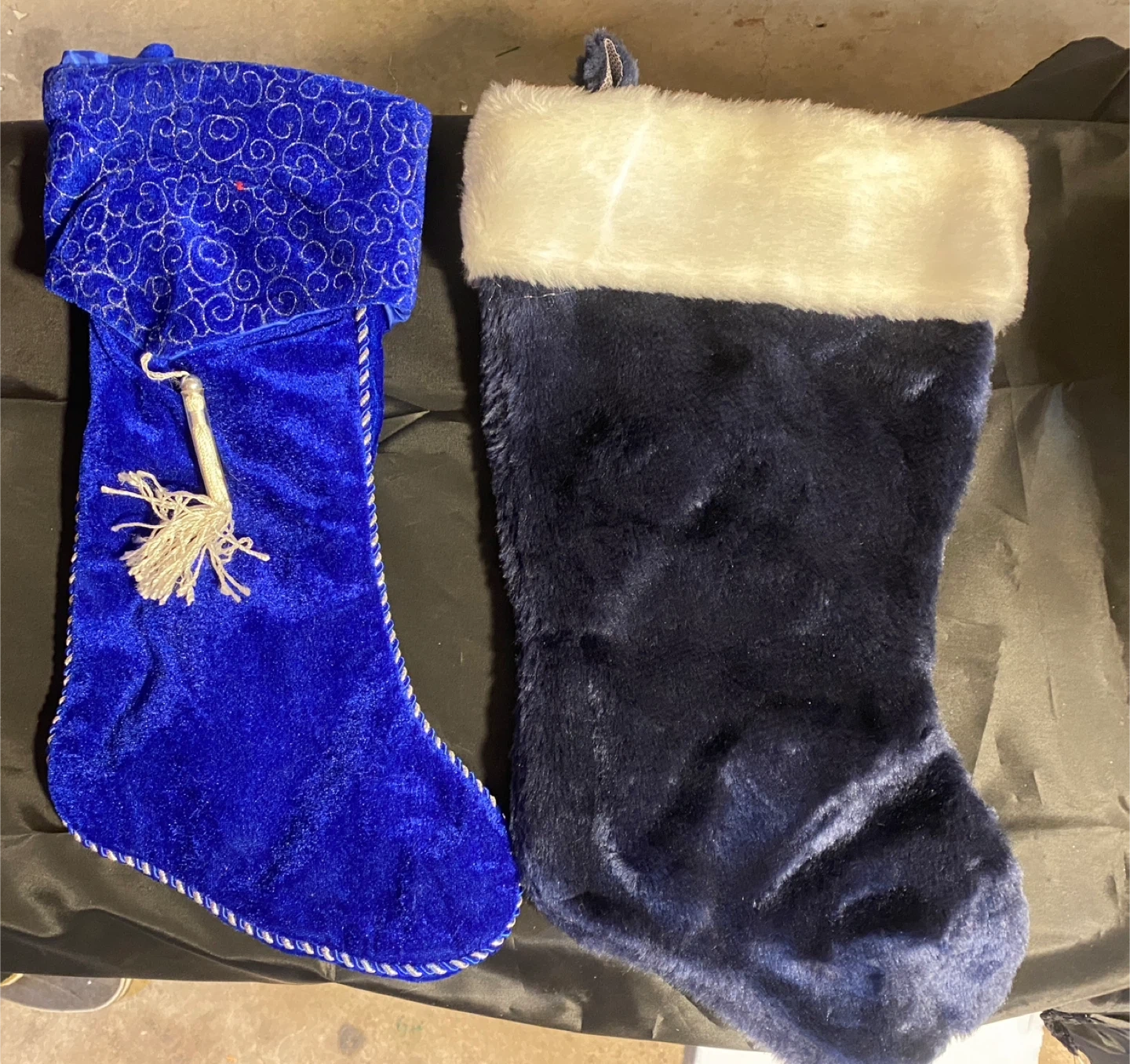 The stockings are primarily made of velvet and faux fur materials. They come in various colors and designs, including deep blue with a snowflake, white with lace, red with a leopard print cuff, dark blue, and bright blue with a decorative tassel.