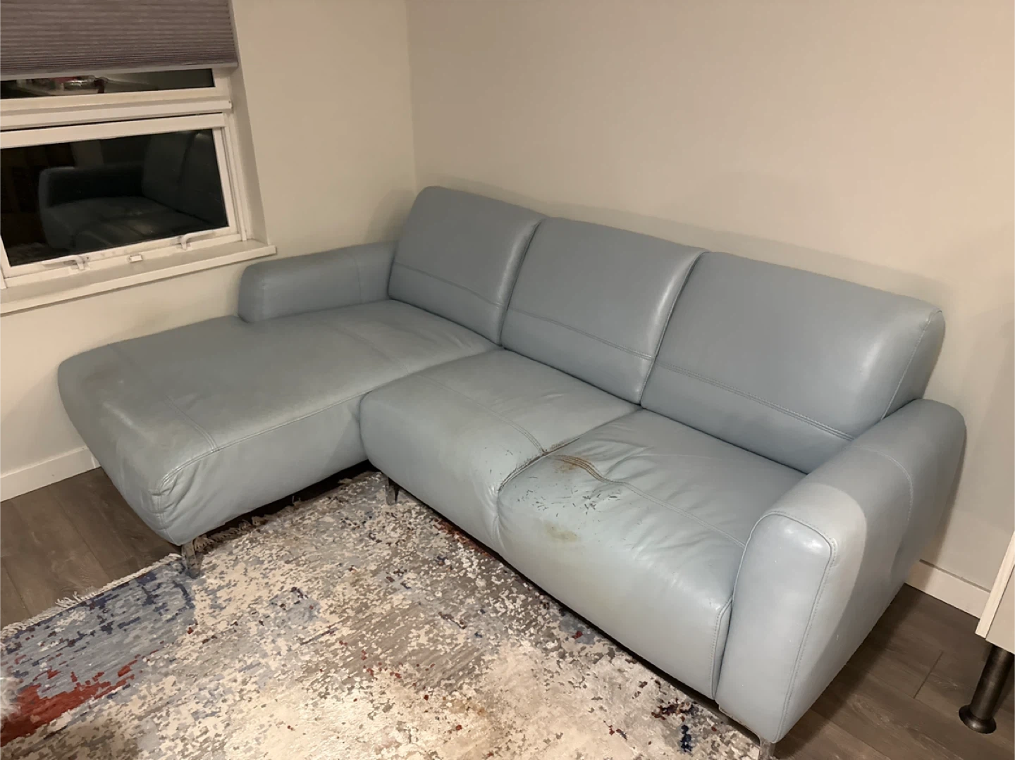 Selling a blue leather sectional sofa with a chaise lounge. It shows signs of wear and tear on the seating area, but it's still comfy and has lots of life left in it! Perfect for a living room or basement.