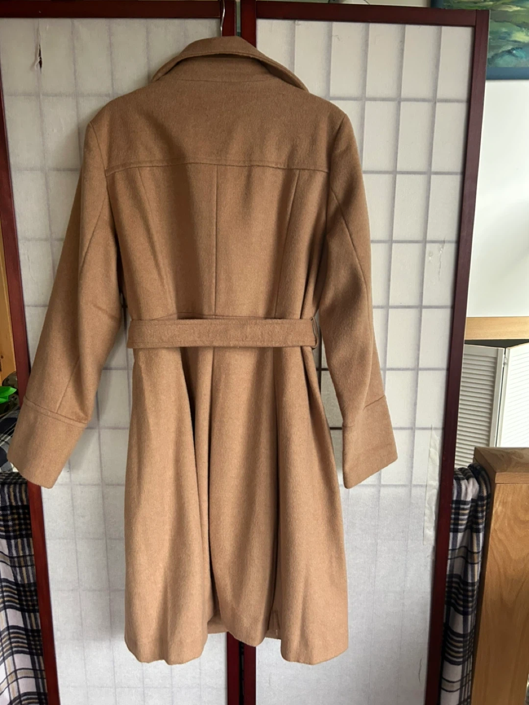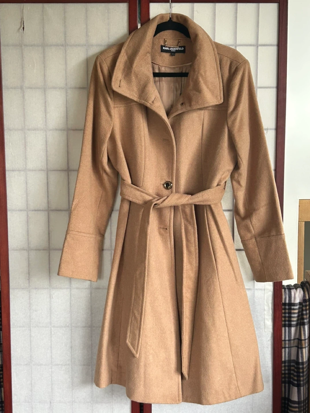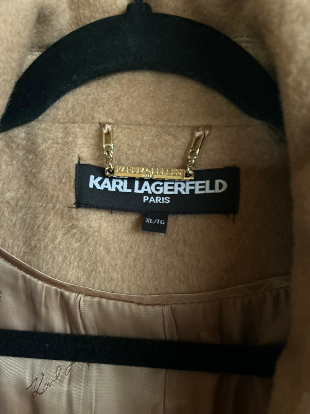 A stylish camel-coloured coat from Karl Lagerfeld Paris! It's a size XL and features a flattering belted design. Perfect for adding a touch of Parisian chic to your wardrobe, wool, high quality