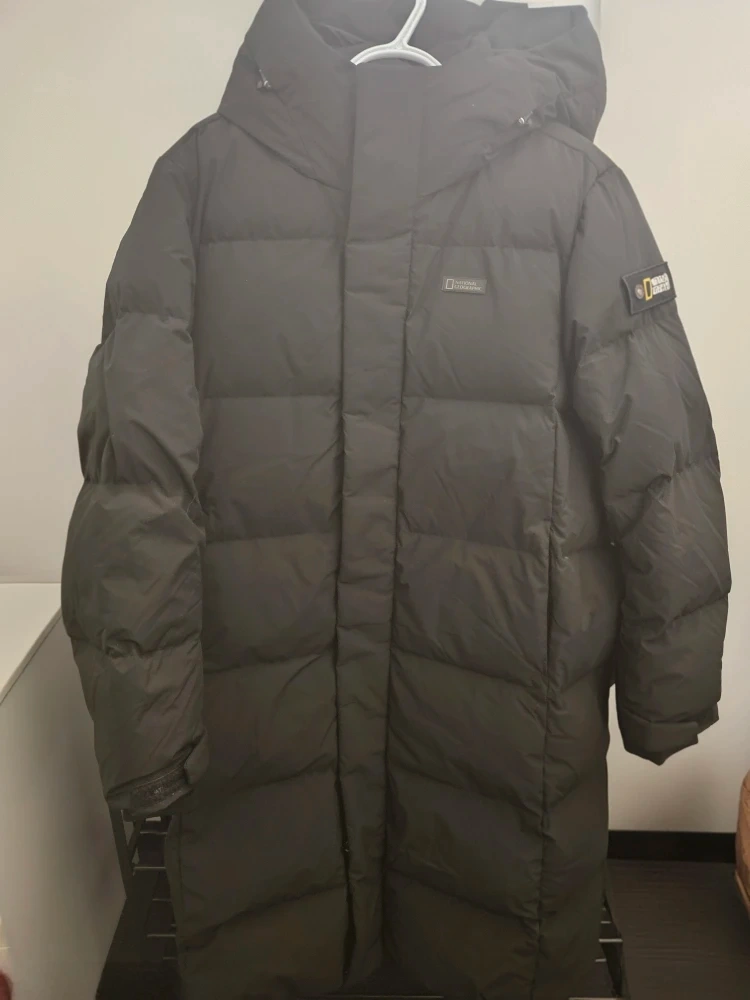 Here's a National Geographic long padded down parka in great condition! It's perfect for staying warm during those cold Canadian winters. It has the National Geographic logo on the front and sleeve