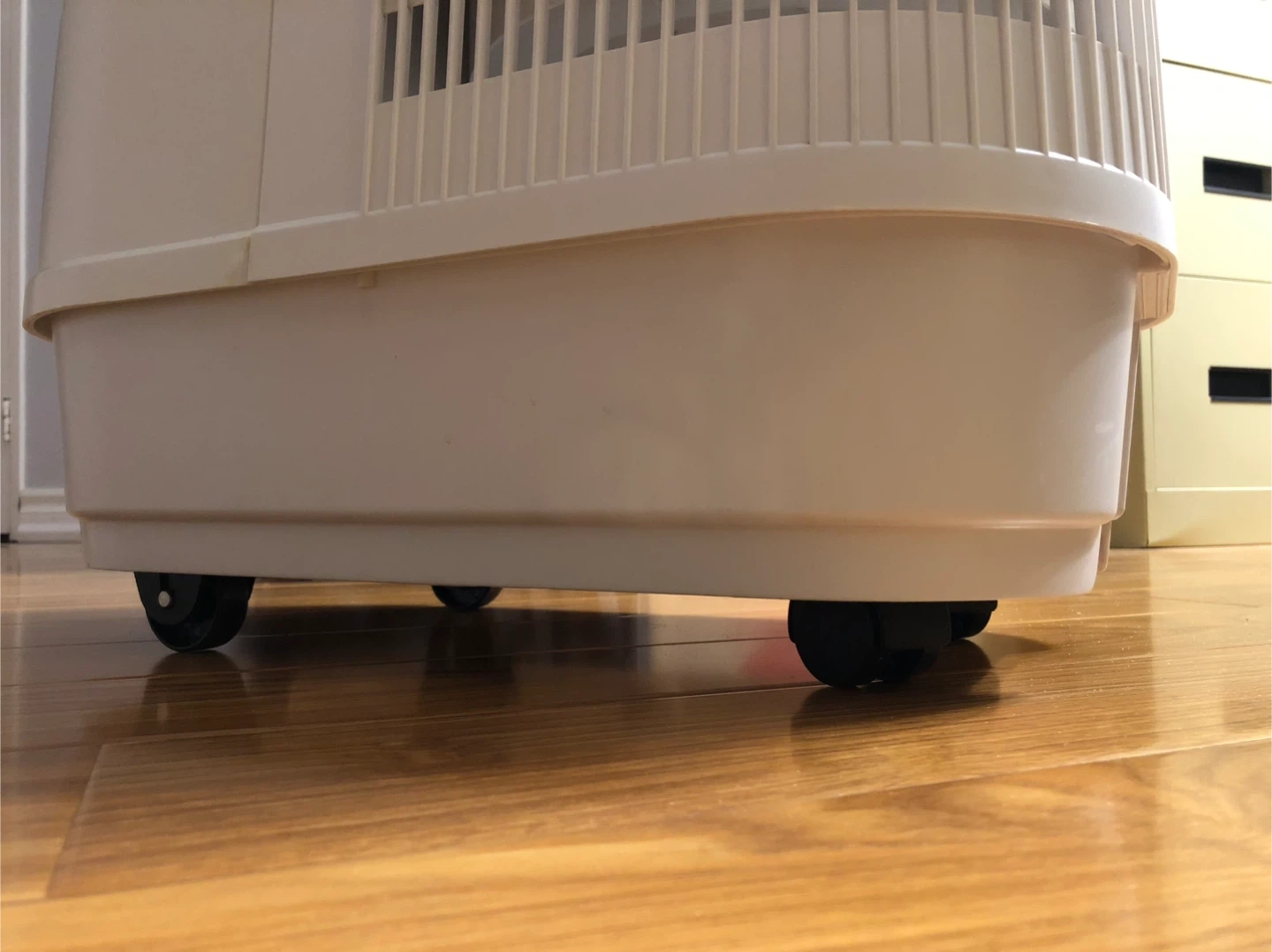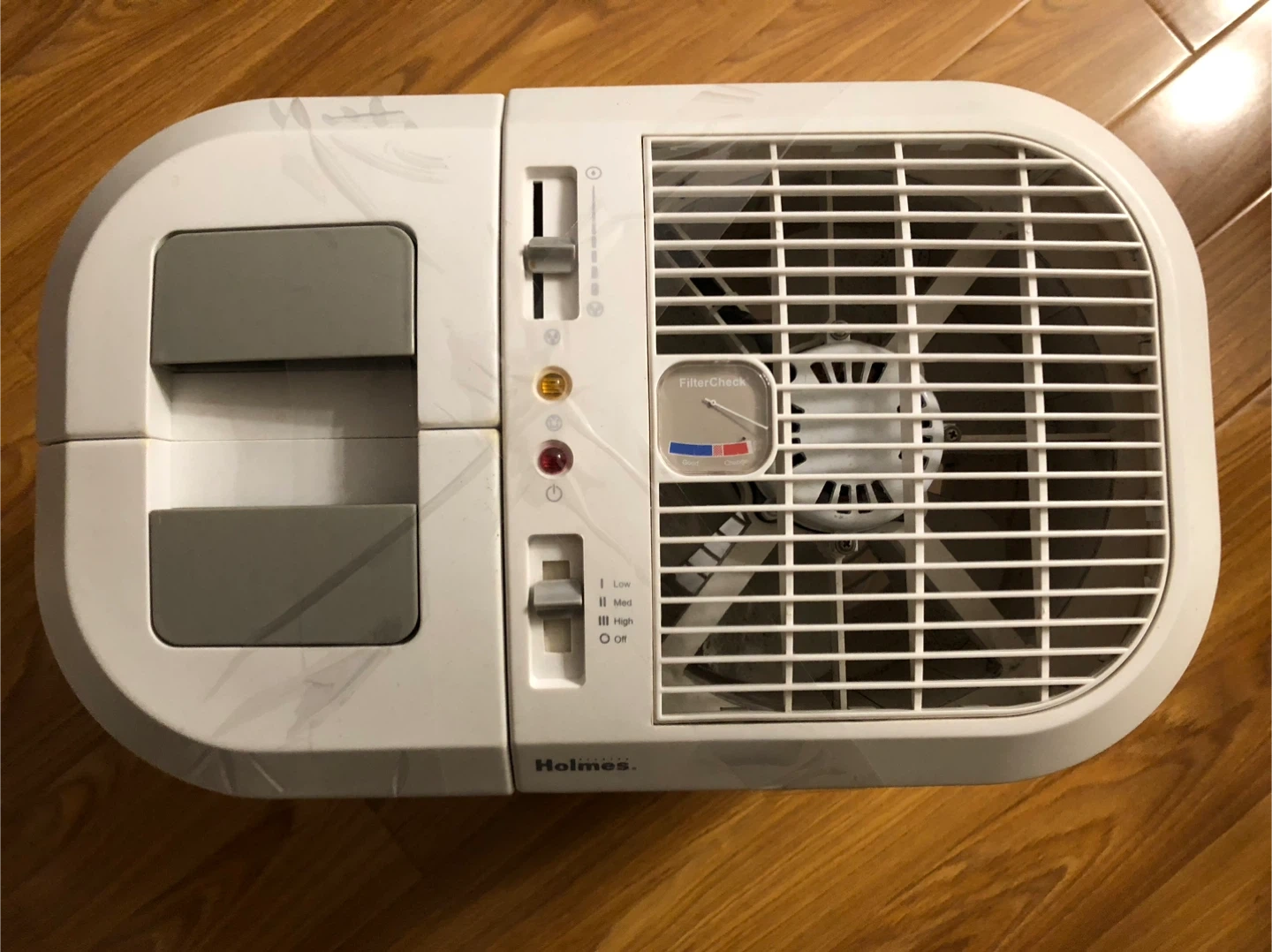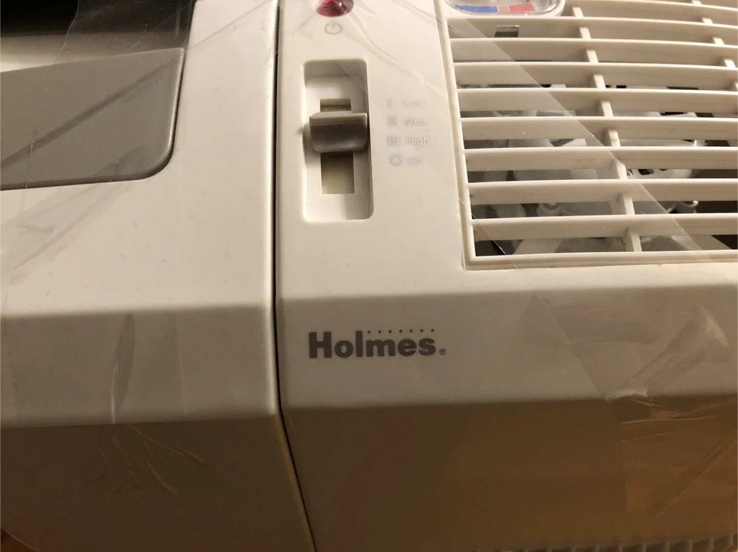 Selling a Holmes HM3500 evaporative humidifier. It's white and in used condition. It has a control panel on top with buttons and a slider. It also has wheels on the bottom for easy moving around. The humidifier has 2 water tanks that can be removed for filling and cleaning