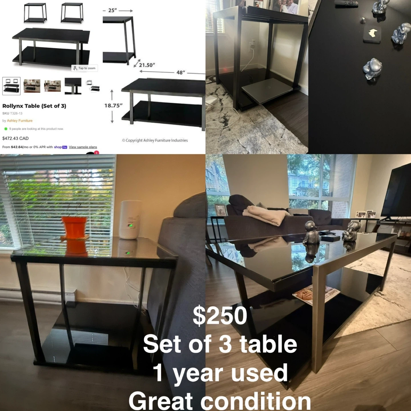 Selling a set of 3 Ashley Furniture Rollynx tables! They're in great condition and have been used for about a year. The set includes a coffee table and two end tables.
