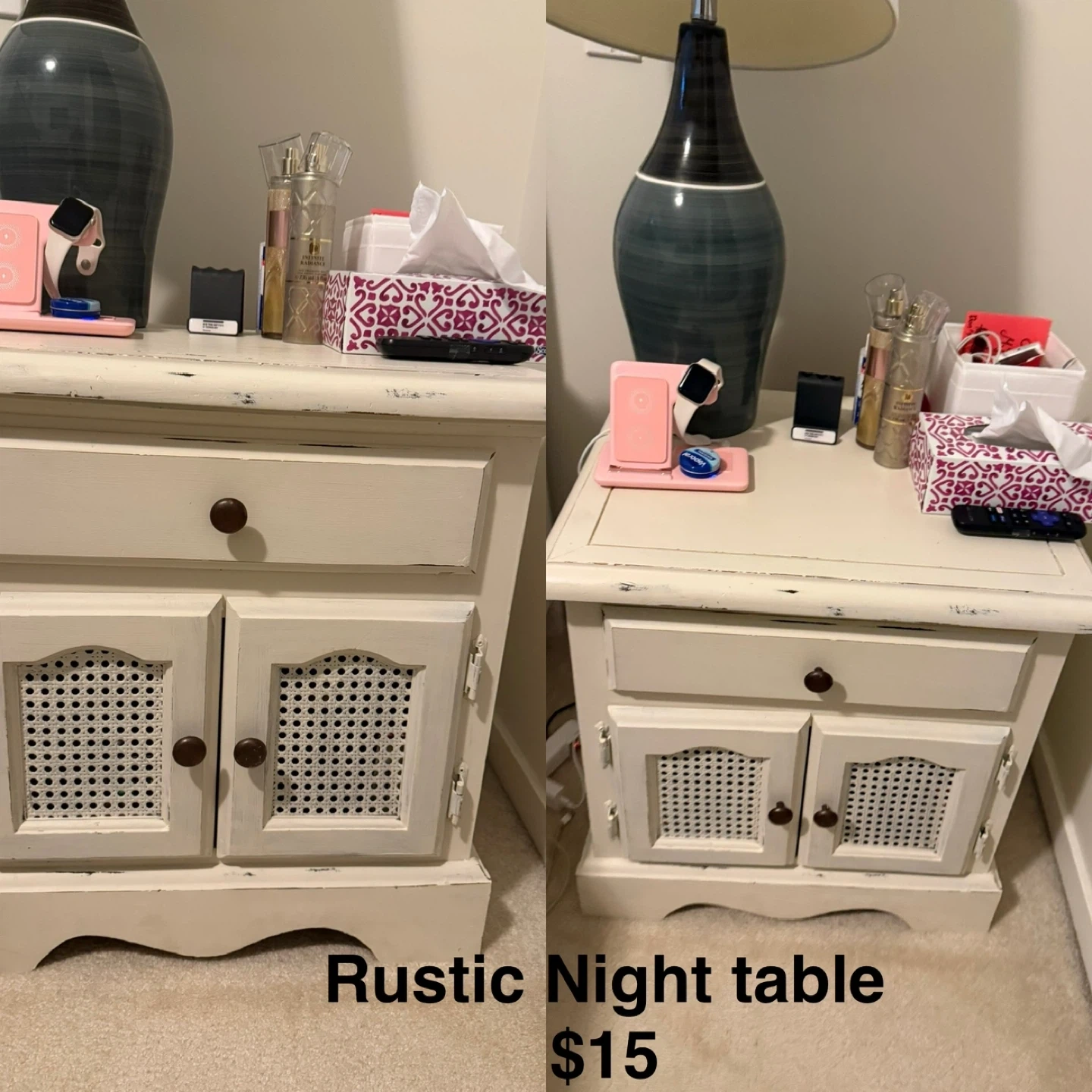 Selling a rustic night table in good condition! It features a drawer and cabinet space with a unique woven design on the doors. Perfect for adding a touch of charm to any bedroom.