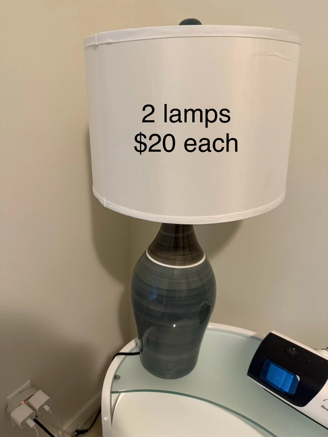 Selling two table lamps for $20 each. They feature a white lampshade and a blue/grey base with a unique design. Great for adding a touch of style to any room!