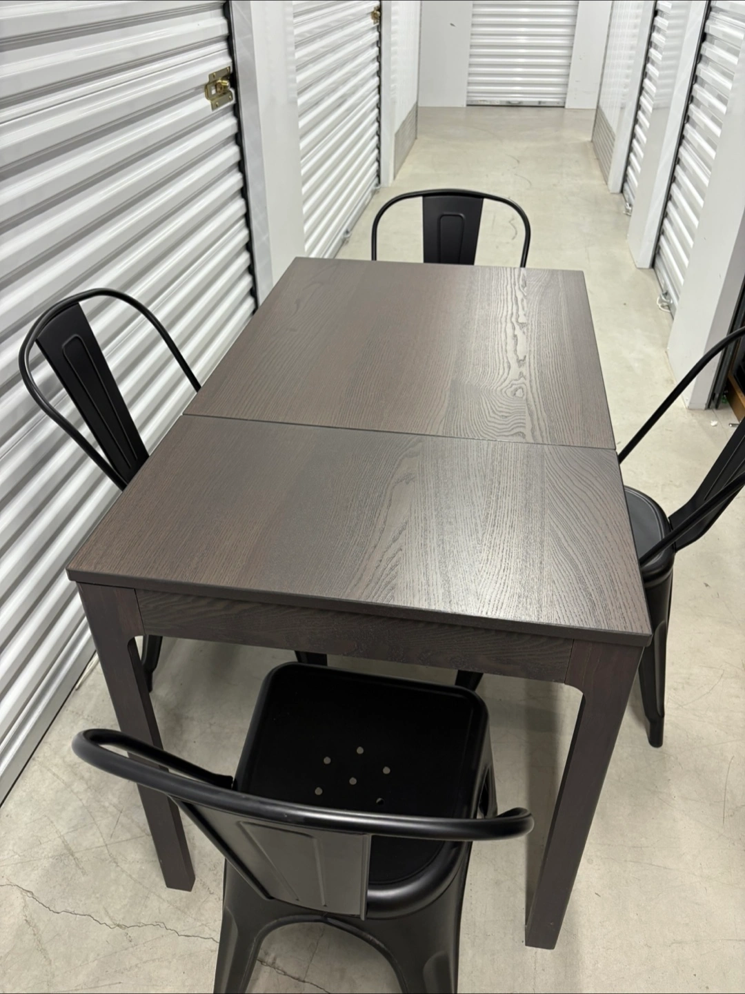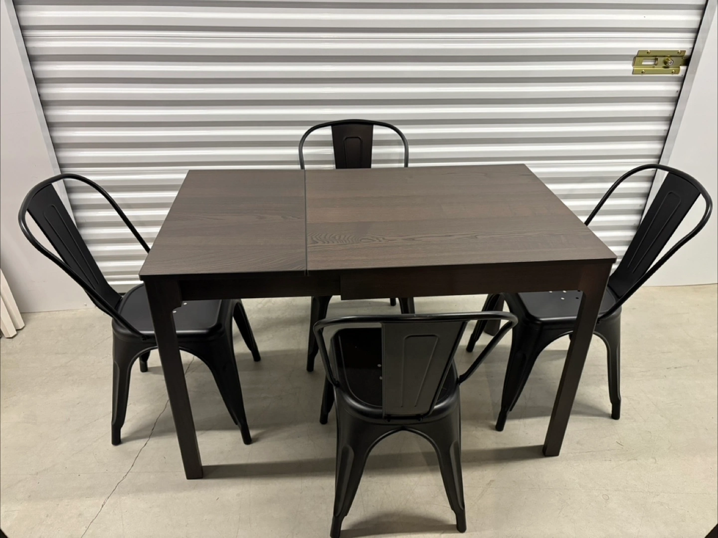 Ikea Ekedalen extendable solid wood table (dark brown) and 4 black metal chairs. The table is in very good condition and the chairs have a few dings here and there. The table is almost in a square shape when not extended which is great for smaller spaces.