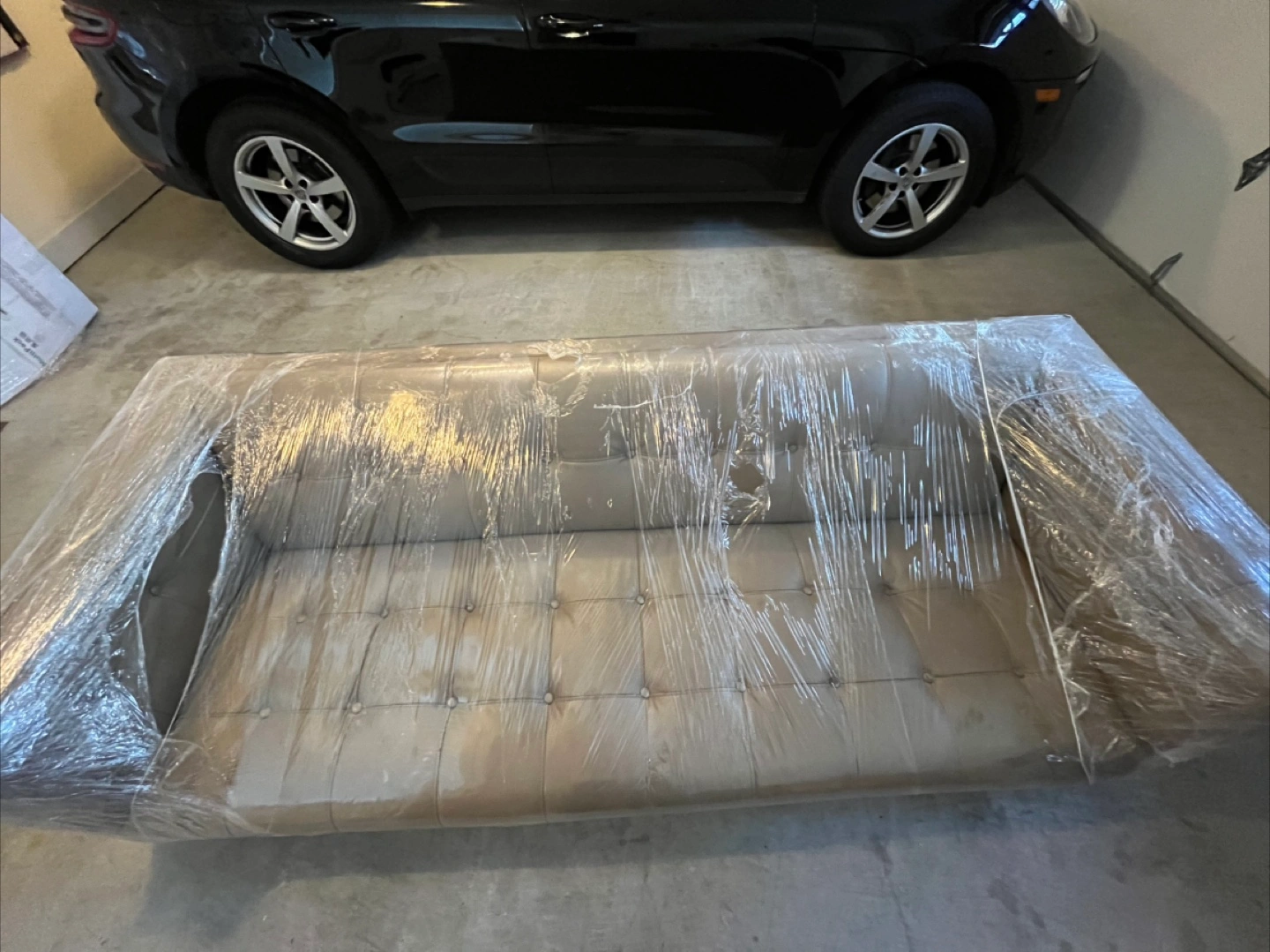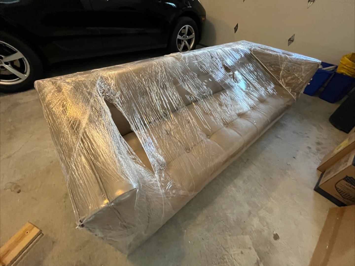 Stylish beige leather tufted sofa for sale in great condition. It will come with five legs but because of easier for transportation, we took it off. The only flaw are the buttons that shows on the picture and the corners . No other tears or stains. Wrapped and ready for transport. Selling only because it doesn’t fit in my new house.