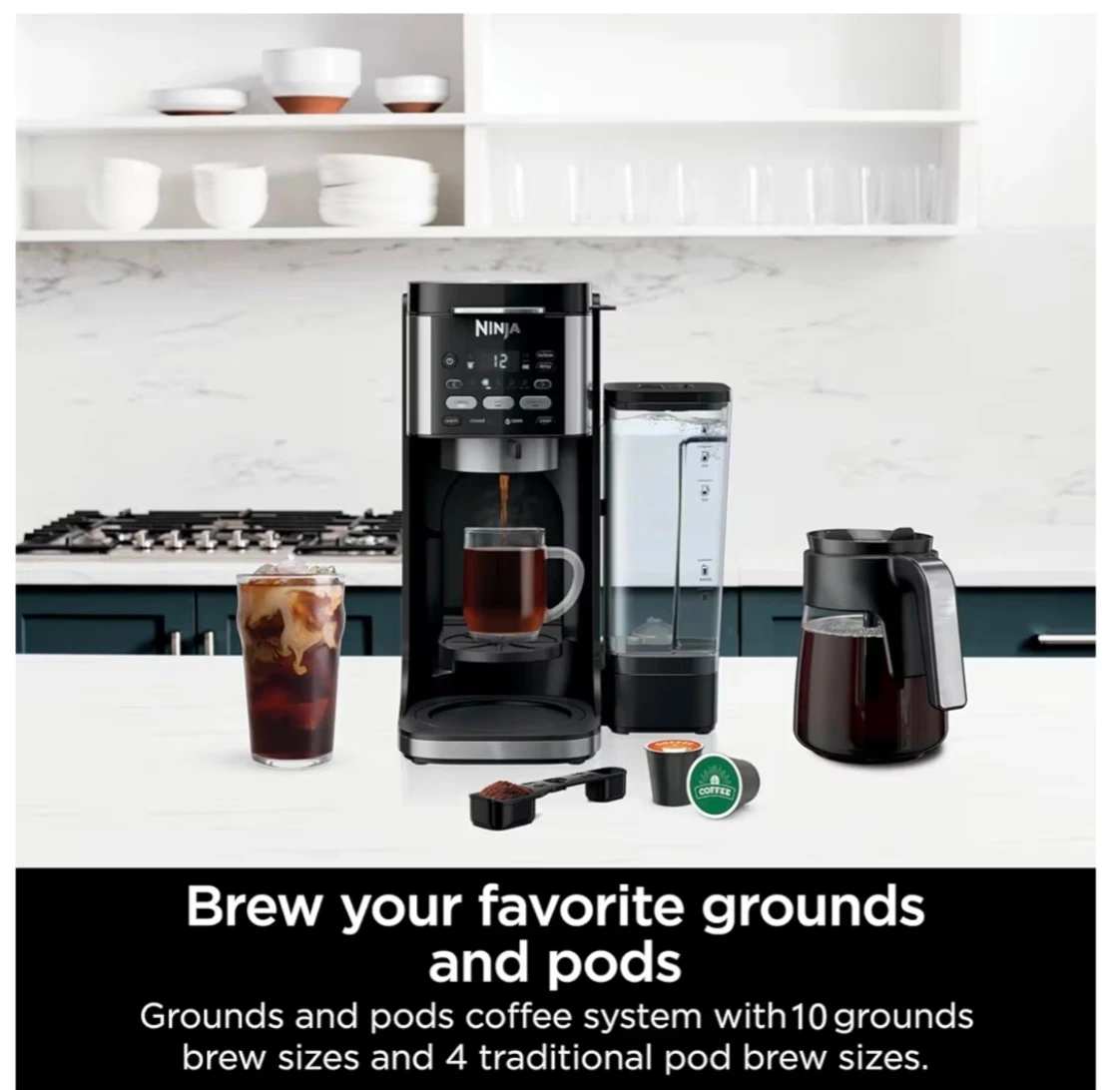 Ninja I Drip Coffee Maker I DualBrew Pro Hot & Iced Coffee 1 Compatible with K-Cup Pods | 3 Brew styles. Enjoy your favourite coffee with this Ninja single-serve coffee maker! It's perfect for brewing both grounds and pods, You can select from classic, rich, or over-ice brew styles to suit your taste.