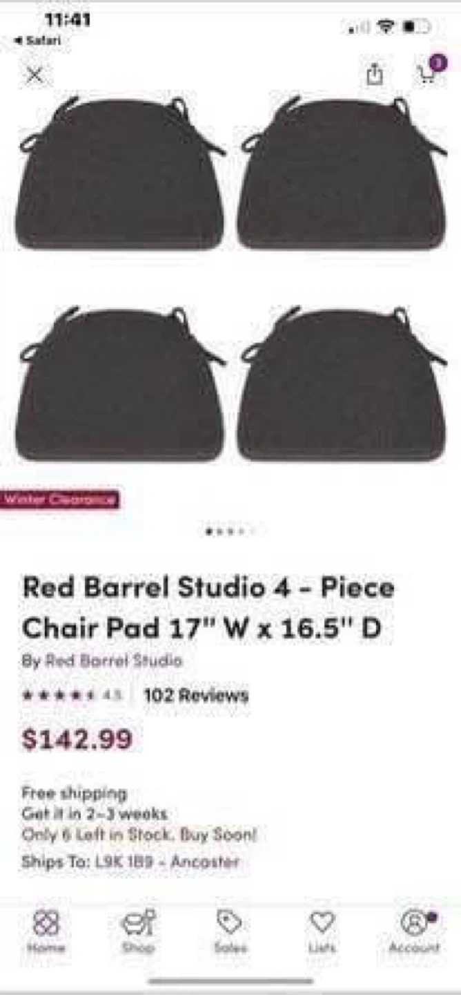 Brand new Red Barrel Studio 4 - Piece Chair Pad 17'' W x 16.5'' D $40 https://www.wayfair.ca/shop-product-type/pdp/red-barrel-studio-chair-pad-cushion-set-of-4-c007390252.html Scenic drive and Mohawk pick up. Xposted.