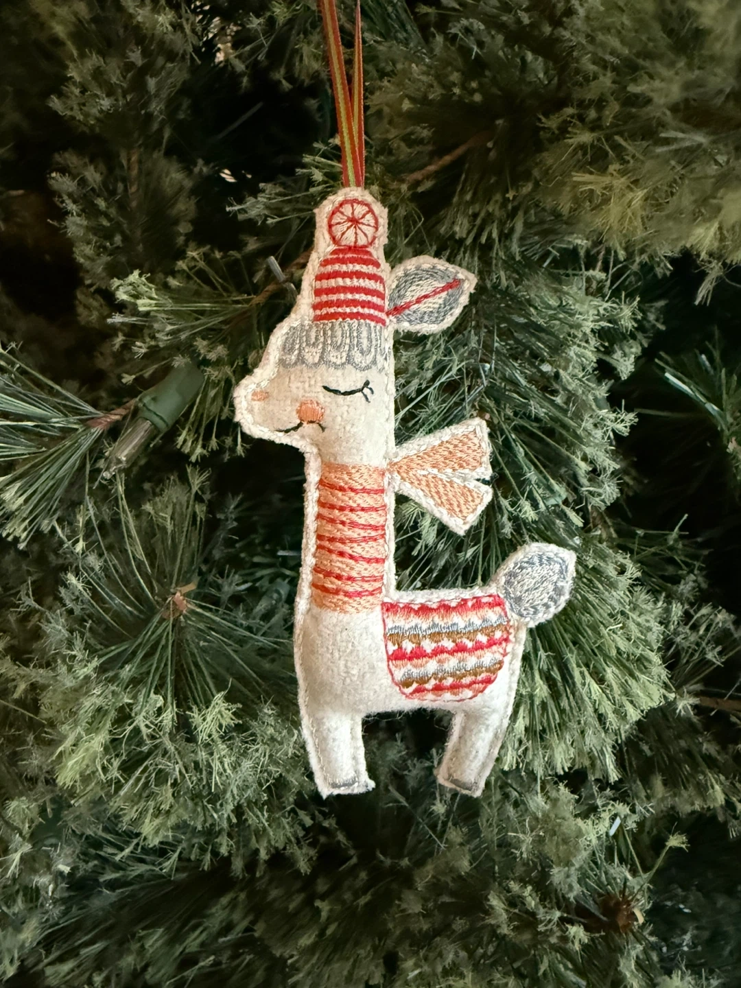 Cute wool llama Christmas tree ornament from Crate & Barrel; measure about 4-5” tall, 2” across