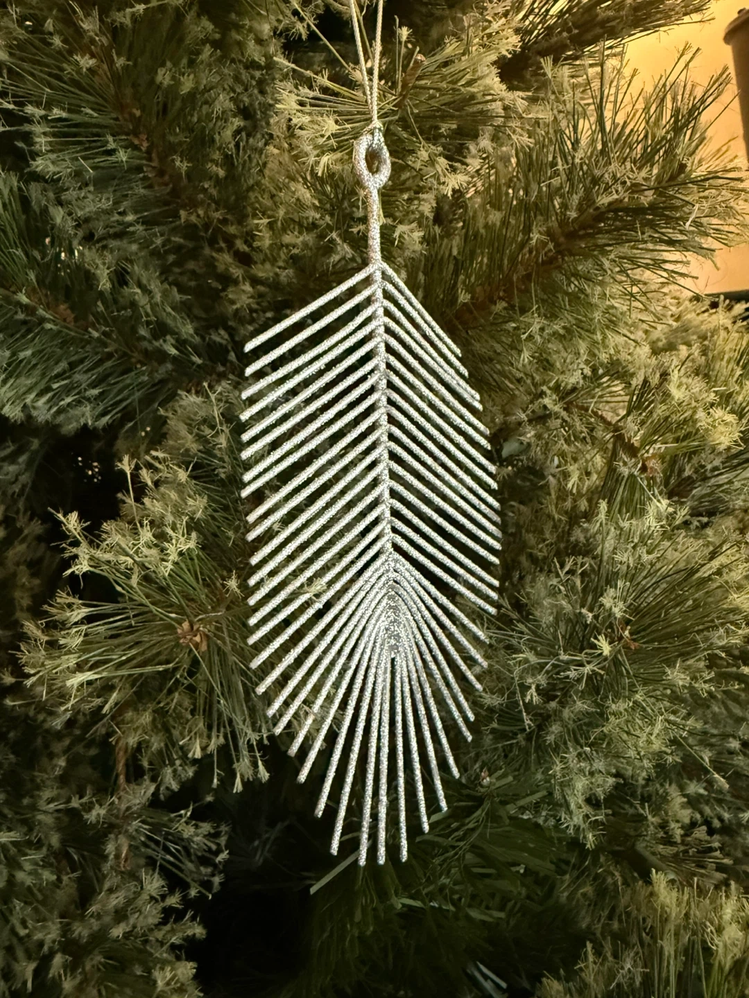 A modern decoration for the discerning, this Crate&Barrel silvery and sparkle-laden feather ornament is made of metal and is in pristine condition.