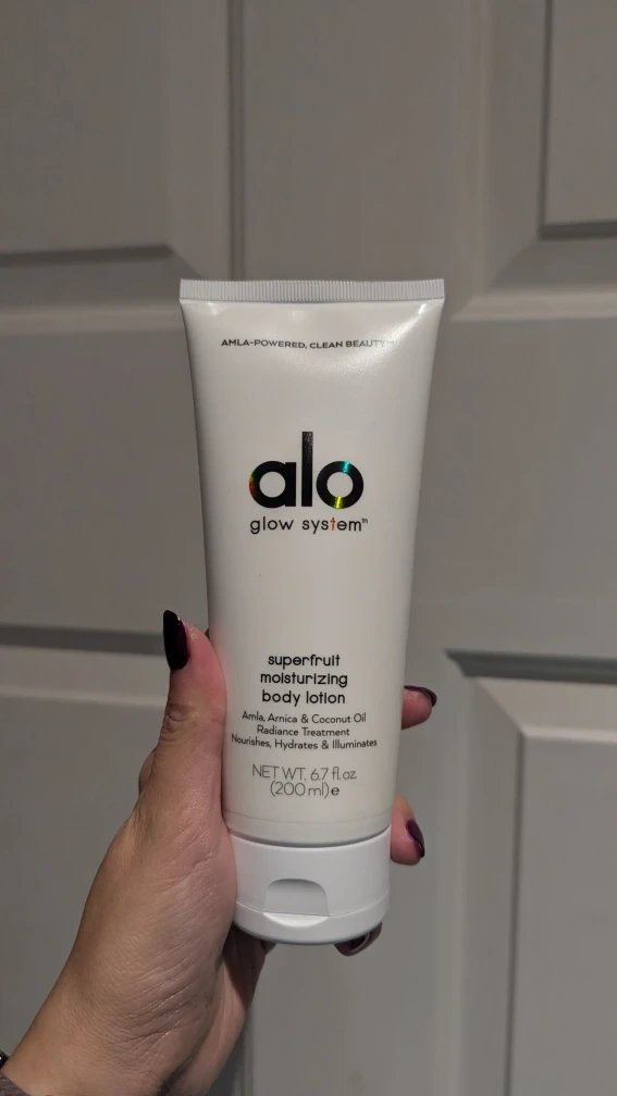 Selling a tube of Alo Glow System Superfruit Moisturizing Body Lotion. It's a radiance treatment that nourishes, hydrates, and illuminates the skin with amla, arnica, and coconut oil.