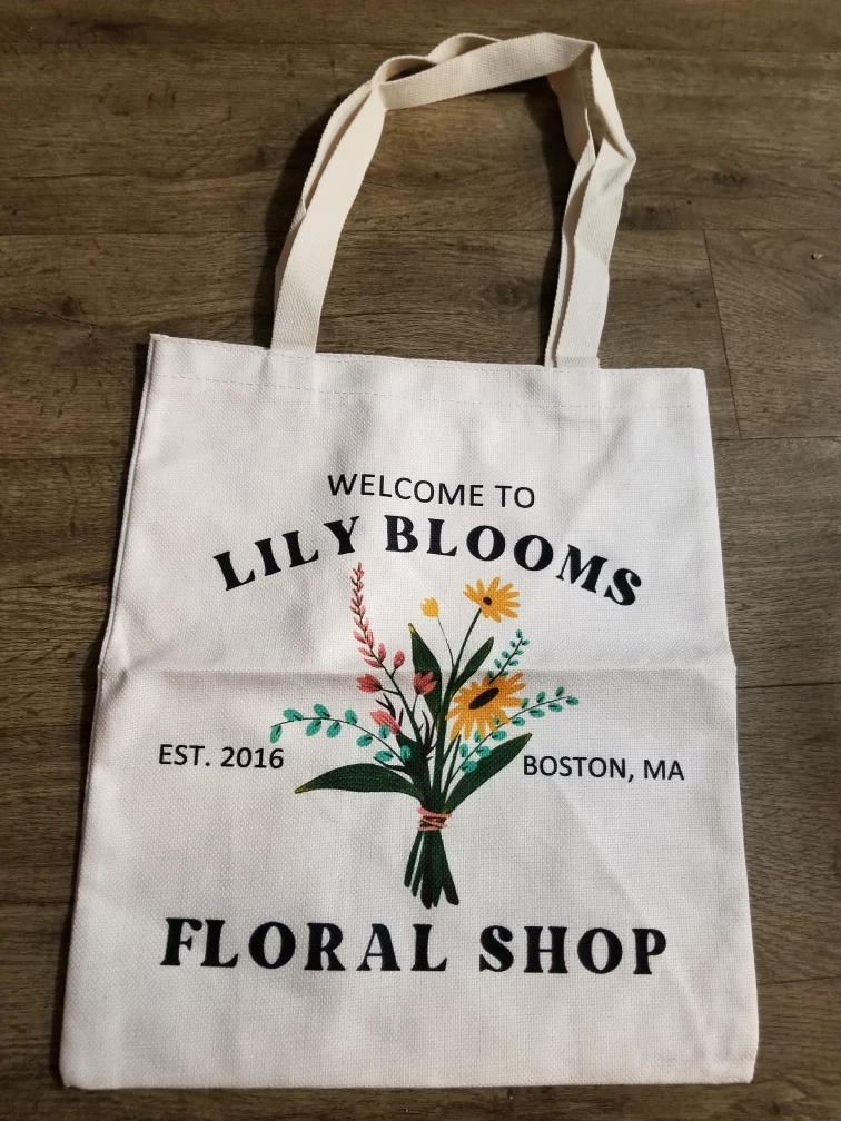 Welcome to Lily Blooms tote bag! This stylish canvas tote features a floral design and the text "Welcome to Lily Blooms, EST. 2016, Boston, MA, Floral Shop". Perfect for carrying groceries, books, or everyday essentials! Brand new