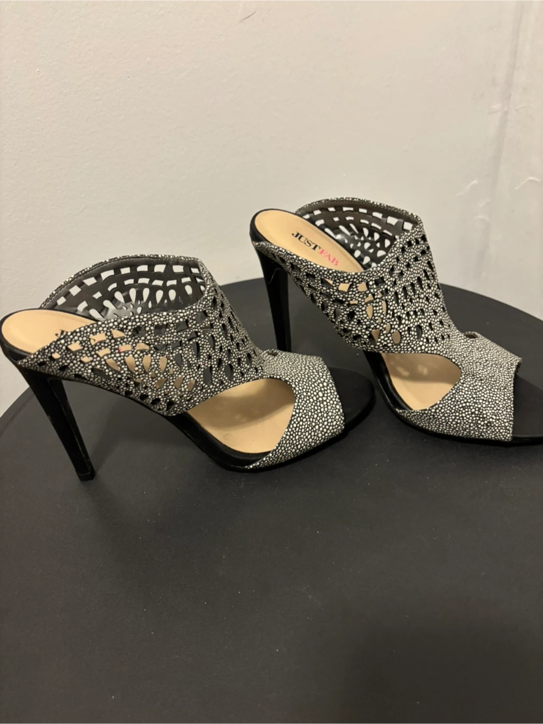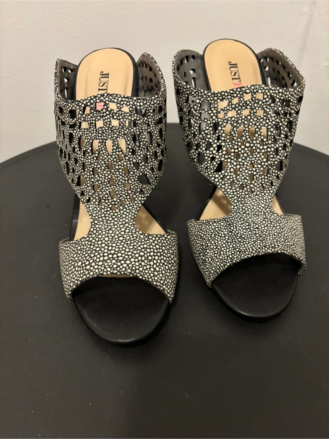 Cute JustFab heels in a black and white pattern, size 10. Perfect for dressing up or a night out!