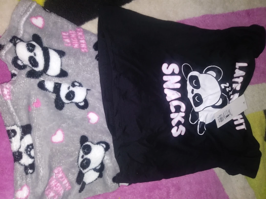 Cute pajama set with a fun panda design! One pair is grey and fuzzy with panda and heart patterns, and the other is black with a panda graphic that says "Late Night Snacks"