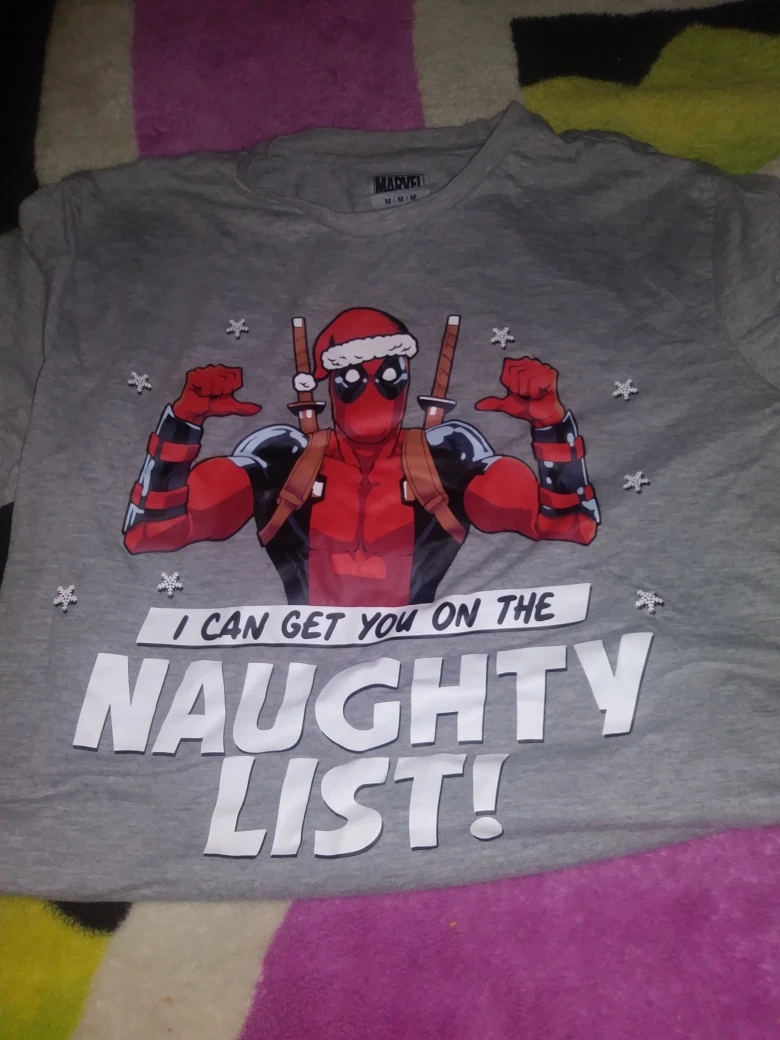 Selling a grey Marvel T-shirt featuring Deadpool in a Santa hat! The shirt says "I can get you on the naughty list!" and is a size M