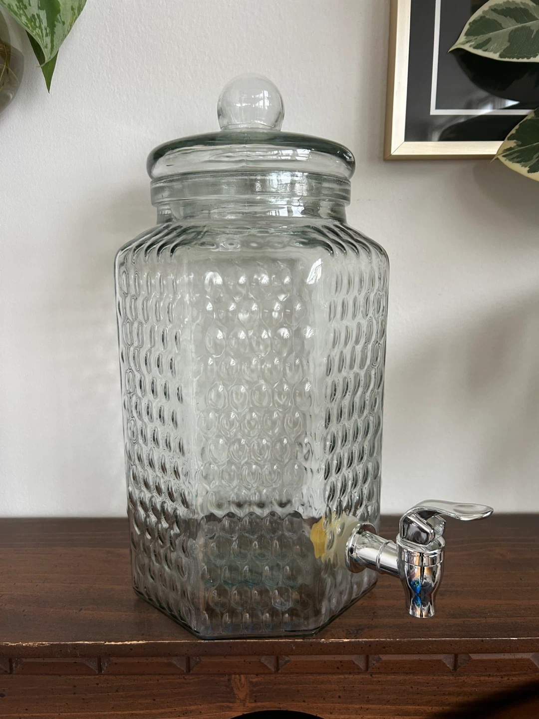 Selling a glass beverage dispenser with a spigot. It's perfect for parties, gatherings, or just keeping your favourite drinks on hand. It's in great condition and ready to use!