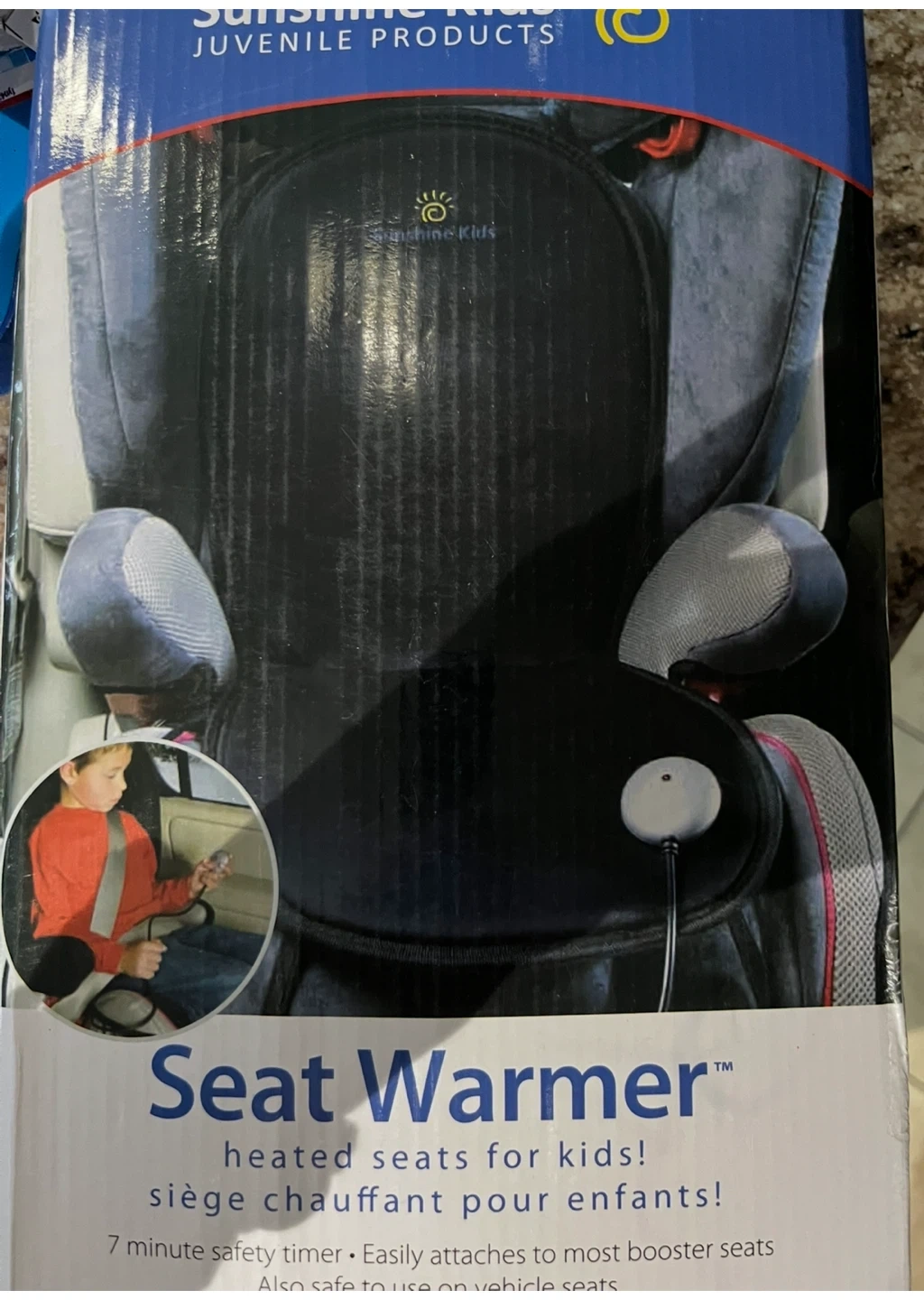 Selling a brand new Sunshine Kids heated seat warmer for kids. It has a 7 minute safety timer and easily attaches to most booster seats. It's also safe to use on vehicle seats
