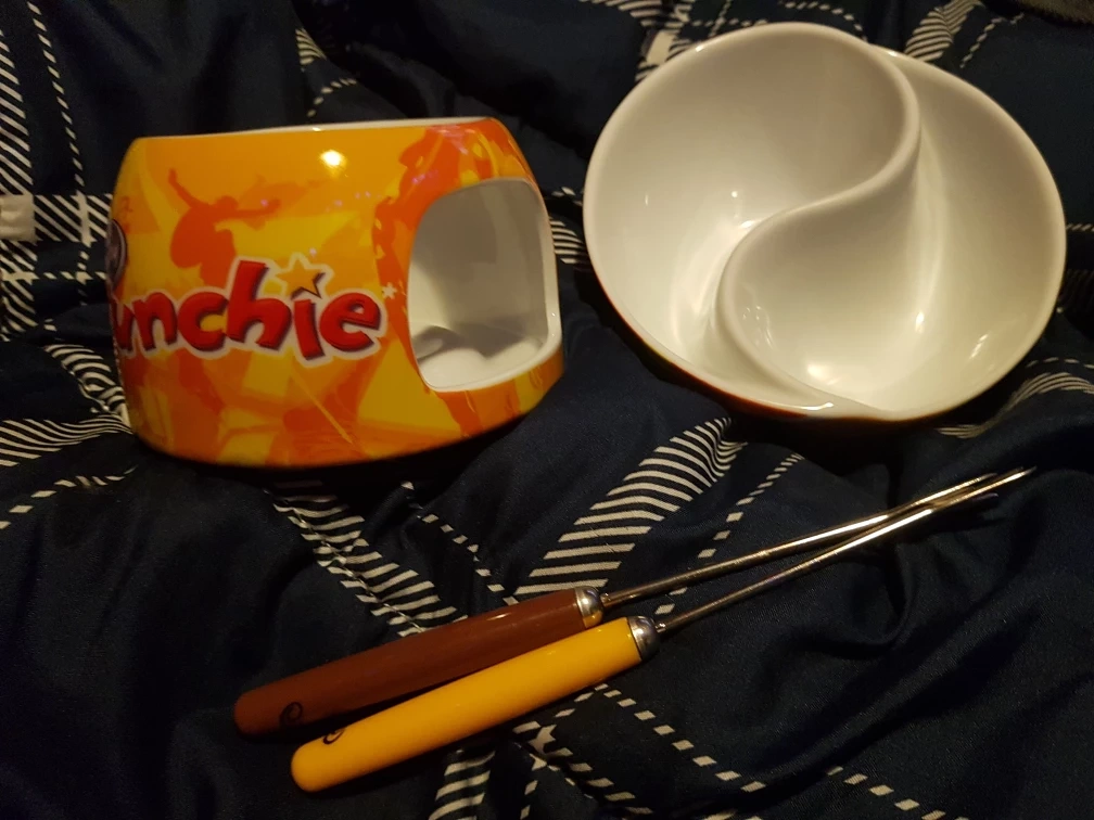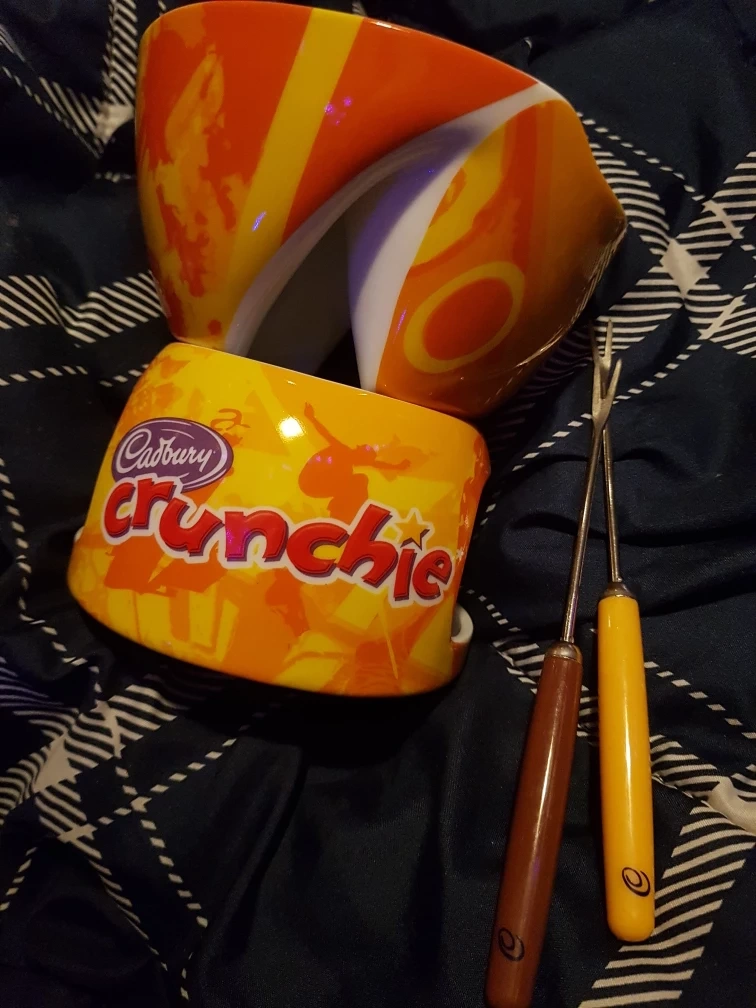 Cadbury Crunchie chocolate fondue set! It comes with the fondue pot, a divided serving bowl, and two fondue forks. Perfect for a fun and tasty treat night!