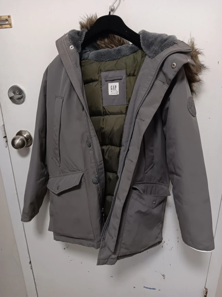 Selling a GAP Kids winter parka in a nice grey/green colour! It's a size large and has a faux fur trim on the hood. Perfect for keeping your little one warm during the cold Canadian winter