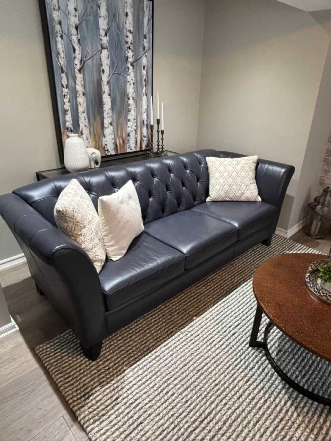 Selling a beautiful, gently used blue leather Chesterfield sofa. It's a classic piece that would look great in any living room or den. The sofa features a tufted back and rolled arms, adding to its elegant design. It's very comfortable and in great condition!