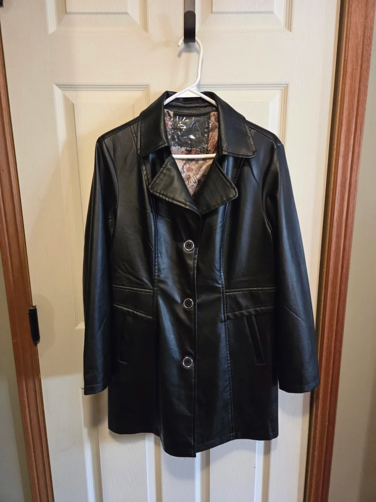 This brand new faux leather jacket in black. It features a button-up front and a stylish floral lining. Perfect for adding a touch of edgy sophistication to your wardrobe!