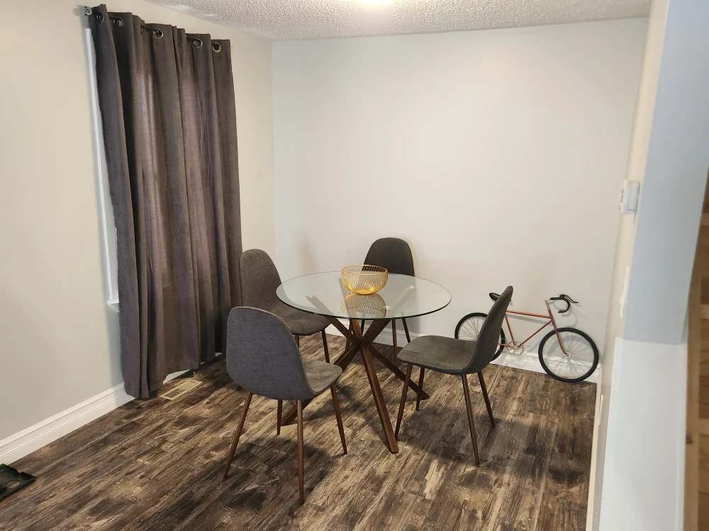 Selling a round glass dining table that comes with four stylish grey chairs. This set is perfect for a smaller dining space or kitchen nook. The table features a sturdy base and the chairs are comfortable and in great condition. This dining set will add a modern touch to your home!
