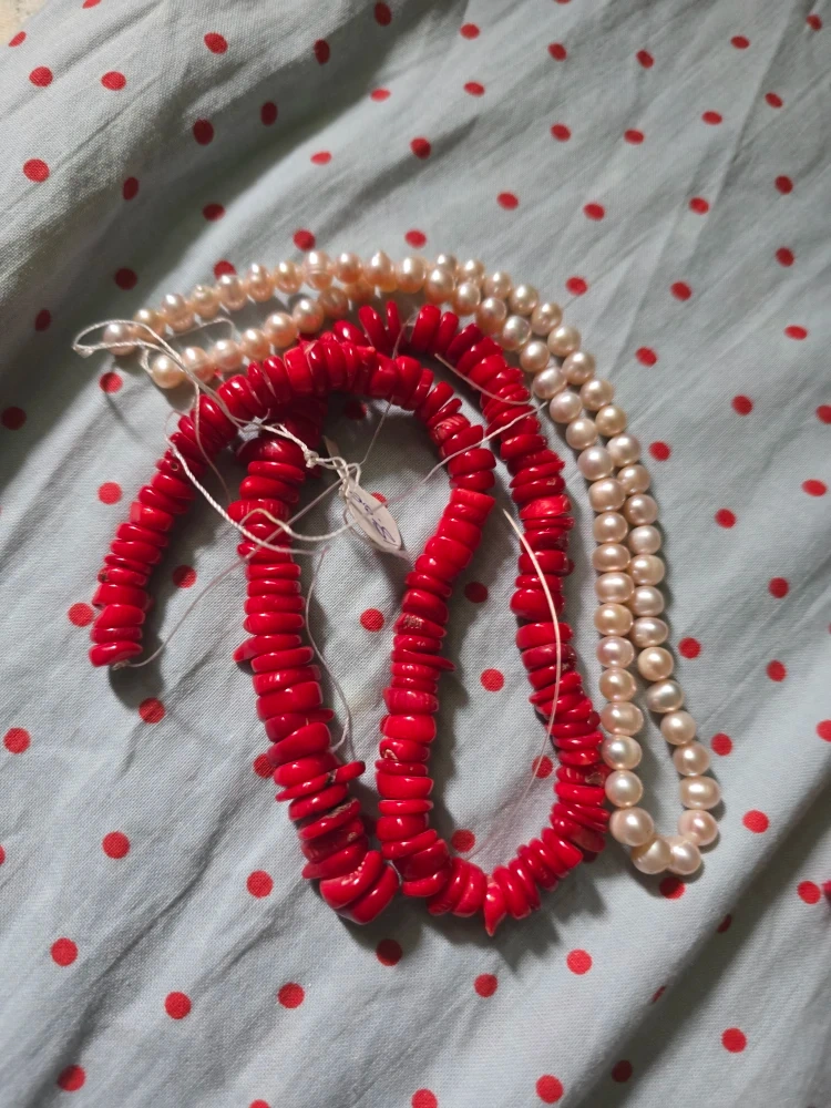 Here are two string of natural ocean wonders, one bright coral and the other of pearls. They're perfect for your new crafty project. Photo under natural morning light by the window facing west. Kindly check my other uncommon goodies and necessities from Japan etc. Make it worth your trip on day of pick up. Most are hard to find and giftable. :) Firm. M1R1S1 BESIDE ESSO Thanks.