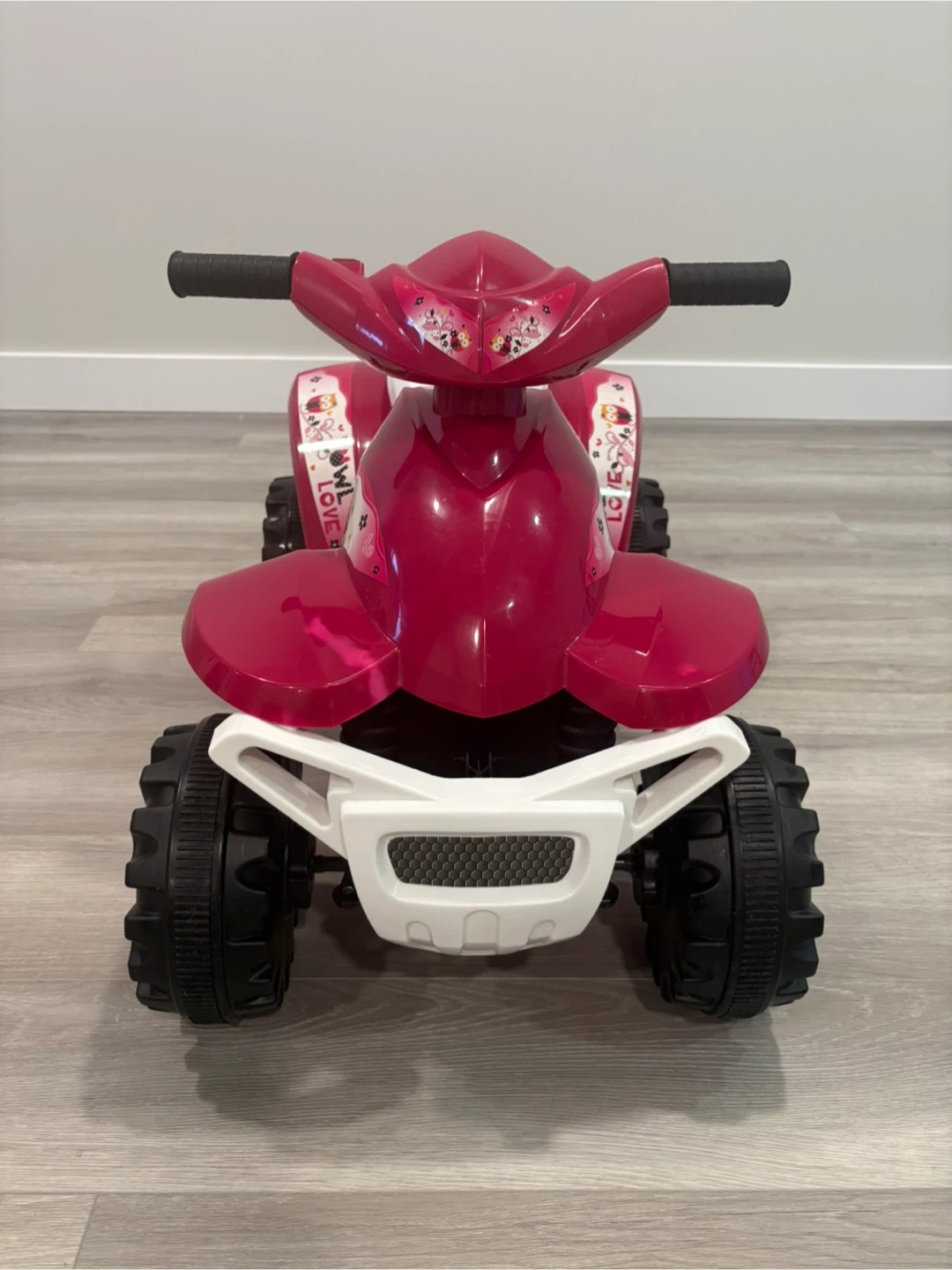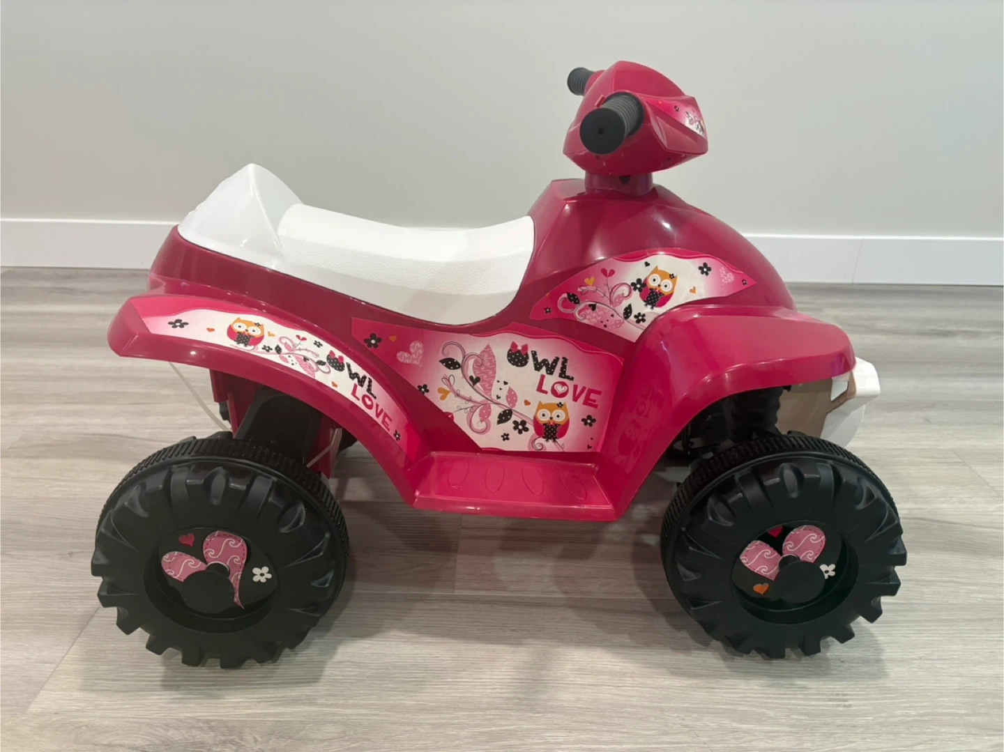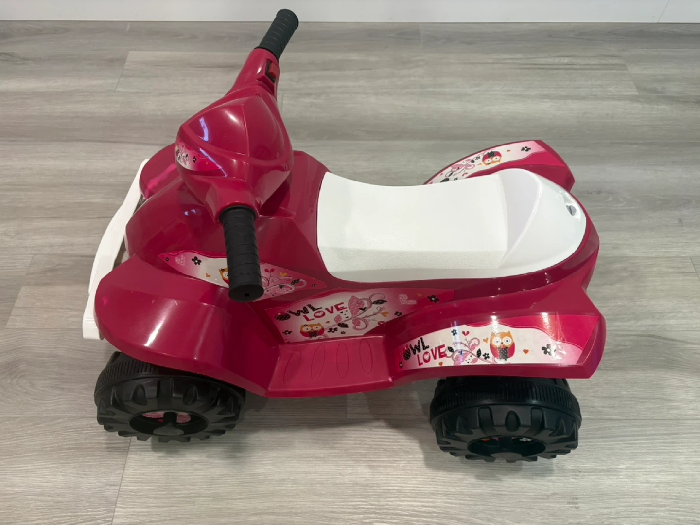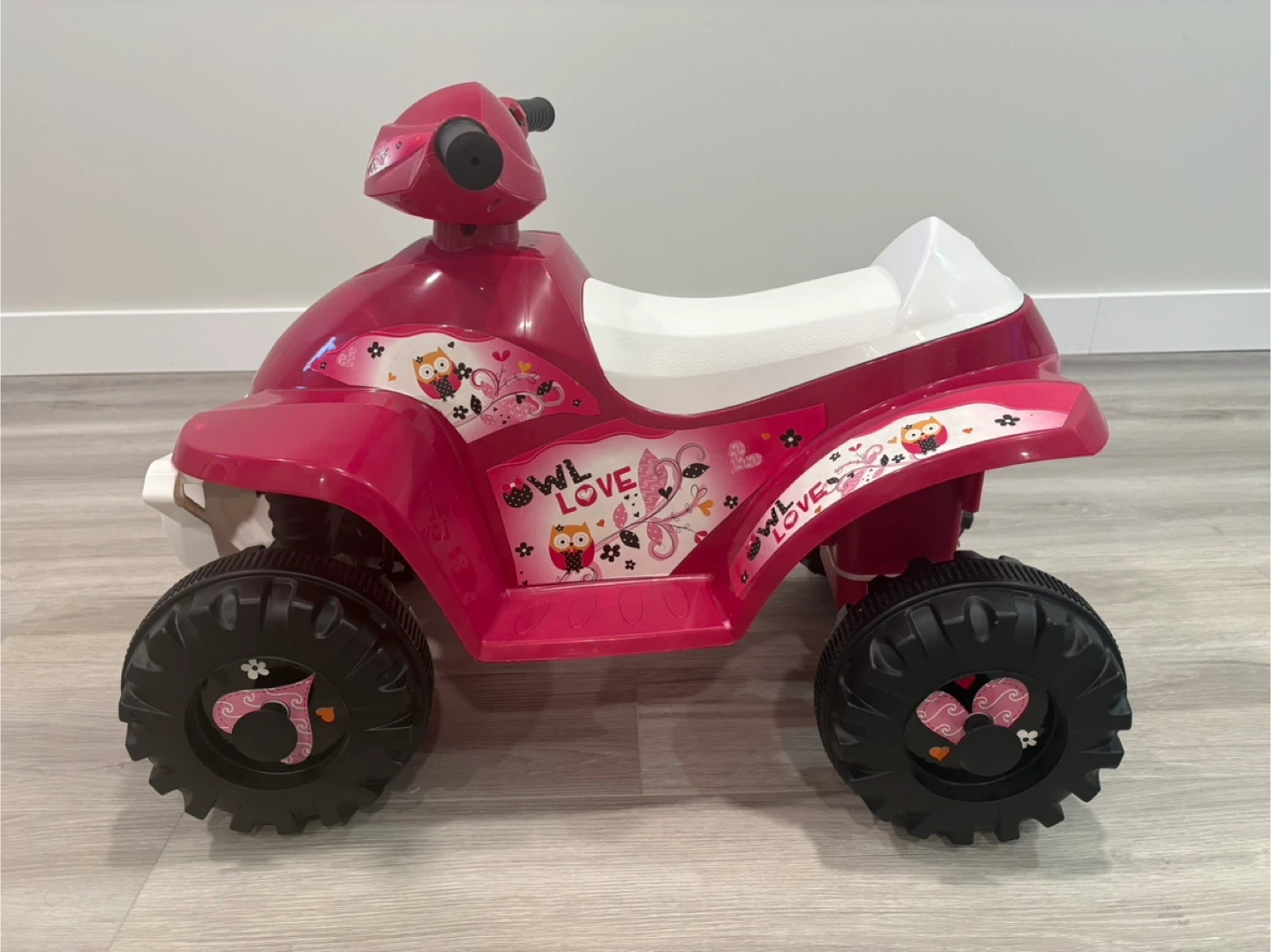 Selling a cute pink ride-on ATV for kids! It has an adorable owl design and is in excellent condition. Perfect for little adventurers! Was used by one child only. Mostly indoors. Like new condition. All pieces included. No missing or broken parts. Battery in great working order. Well taken care of. Was stored indoors and cleaned regularly No smoking, no pet home.