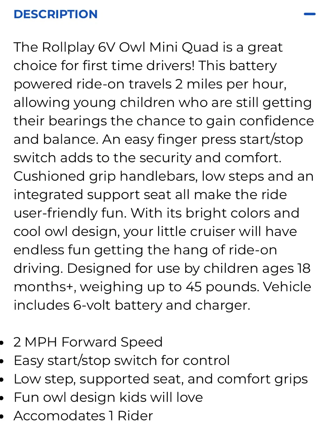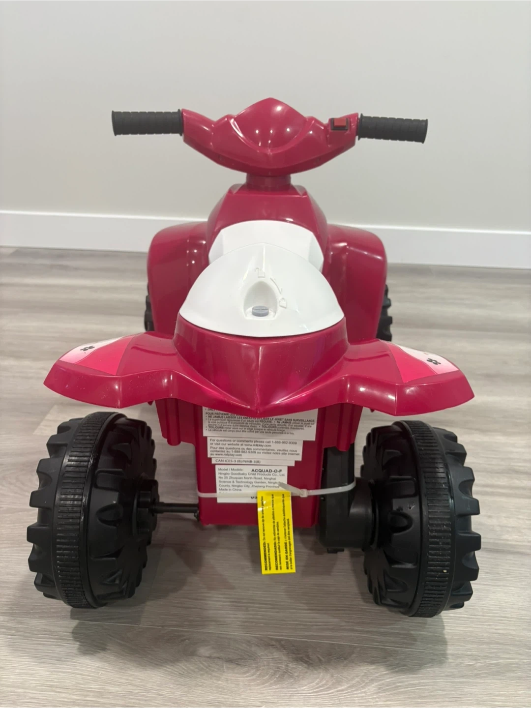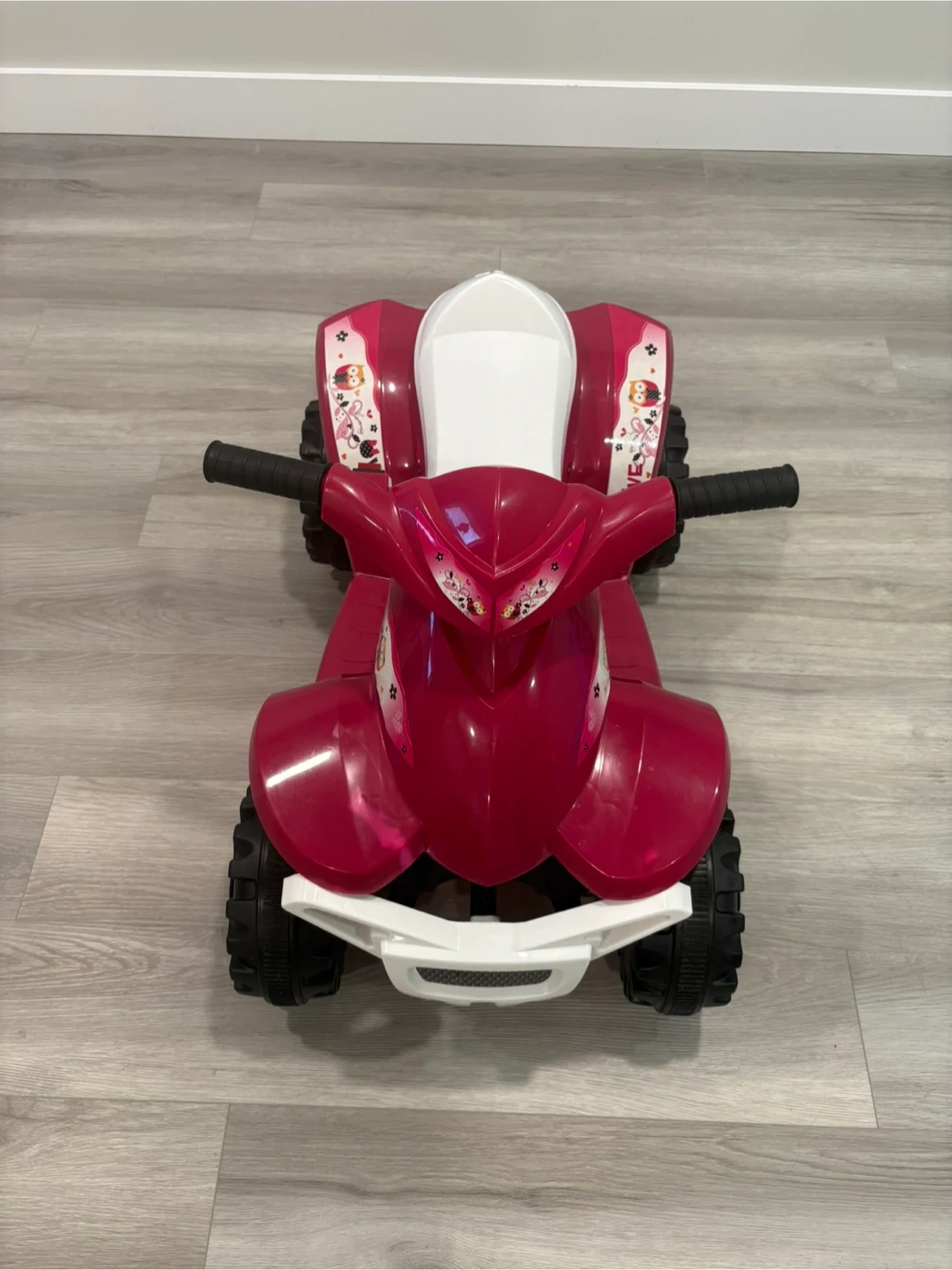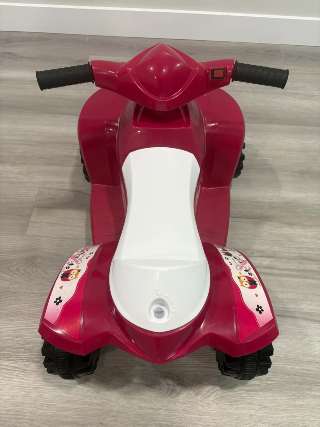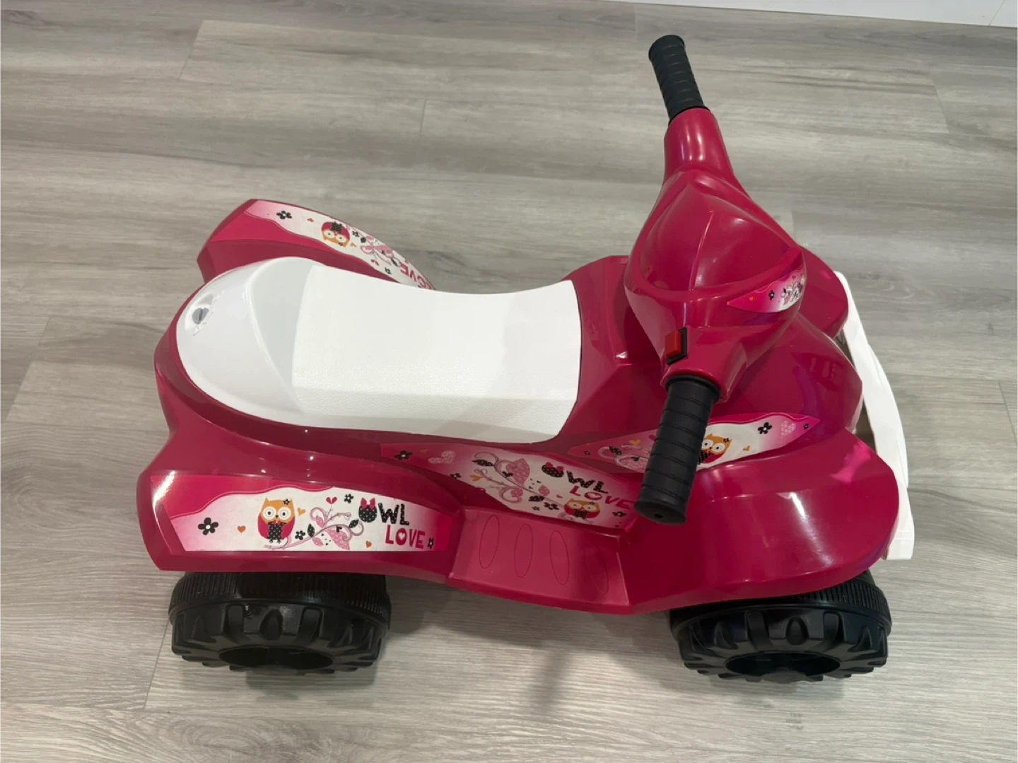 Selling a cute pink ride-on ATV for kids! It has an adorable owl design and is in excellent condition. Perfect for little adventurers! Was used by one child only. Mostly indoors. Like new condition. All pieces included. No missing or broken parts. Battery in great working order. Well taken care of. Was stored indoors and cleaned regularly No smoking, no pet home.