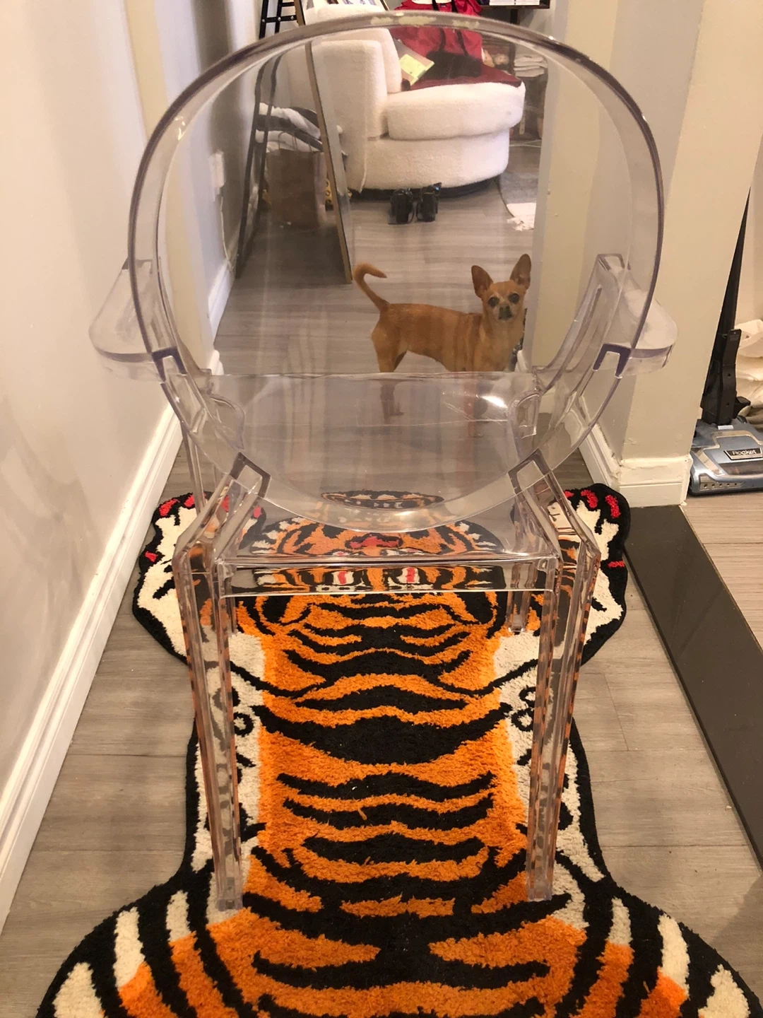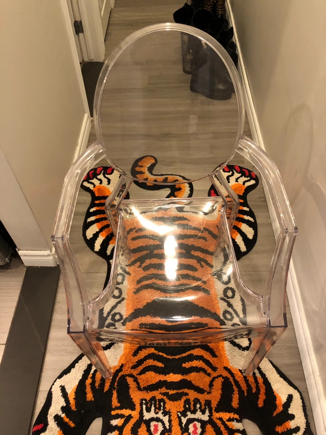 Selling a clear acrylic ghost chair. It's in great shape and would look great in any room! It's a stylish and modern piece of furniture that's also very comfortable a few scratches but otherwise I’m good condition