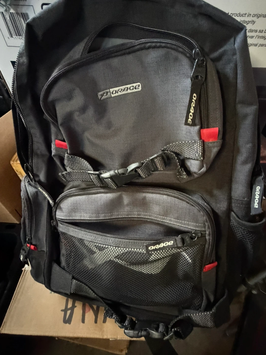 Selling a black backpack from Orage. In good condition and has lots of compartments. Perfect for school, sports or travel!