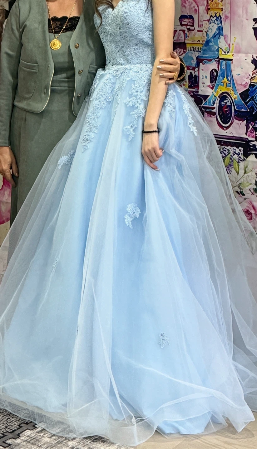 Selling a light blue formal dress, perfect for a special occasion! The dress features delicate lace detailing and a flowing skirt. It's in great condition and ready for a new home!