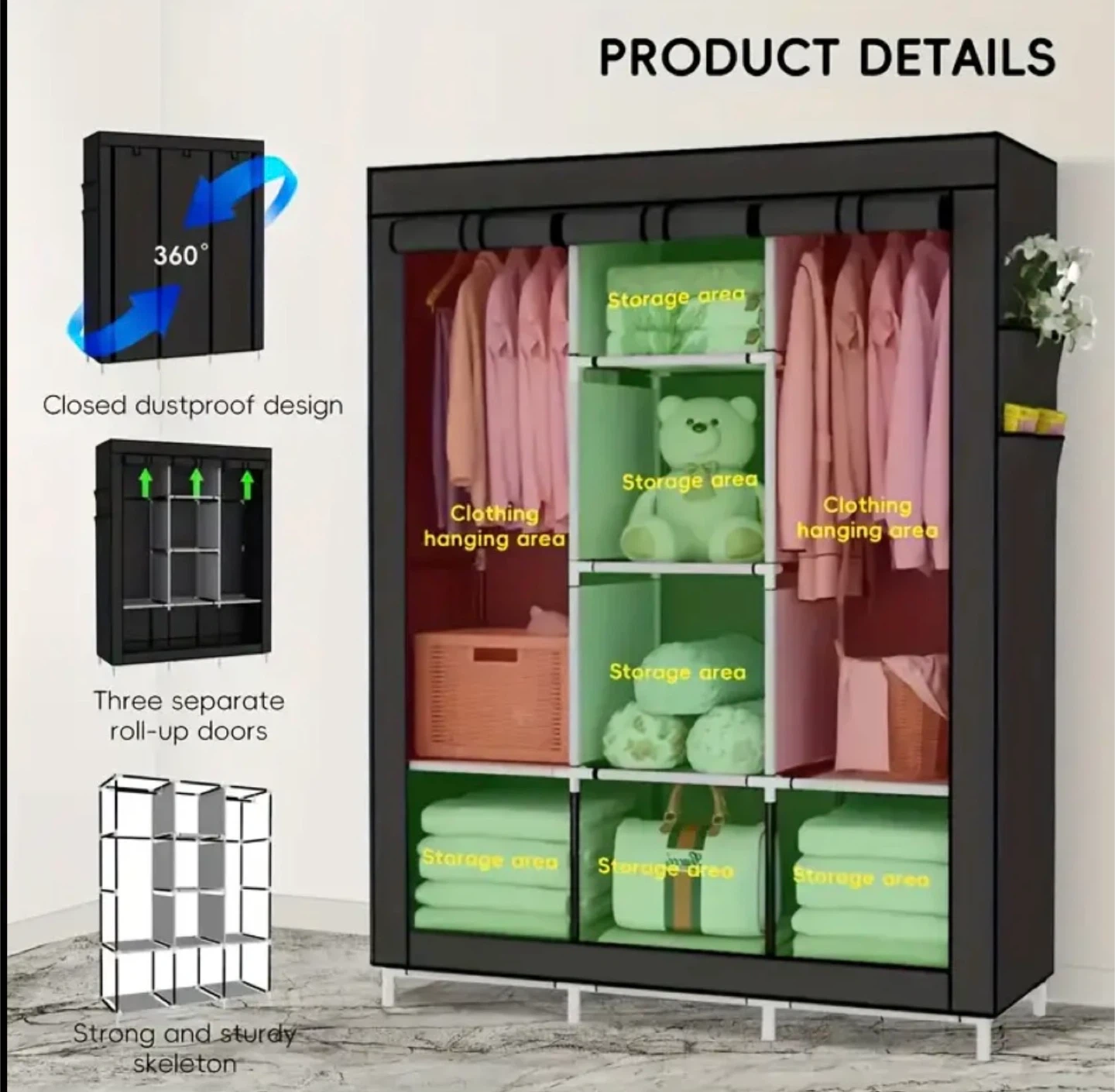 This multi-functional storage wardrobe is great for organizing your clothes and other items! It features a closed dustproof design and three separate roll-up doors. The dimensions are 130cm x 45cm x 170cm (51.18" x 17.72" x 66.93"). It has a strong and sturdy skeleton with a bold steel pipe for a strong load-bearing capacity. It's a nail-free installation and provides multi-functional storage and saves space.