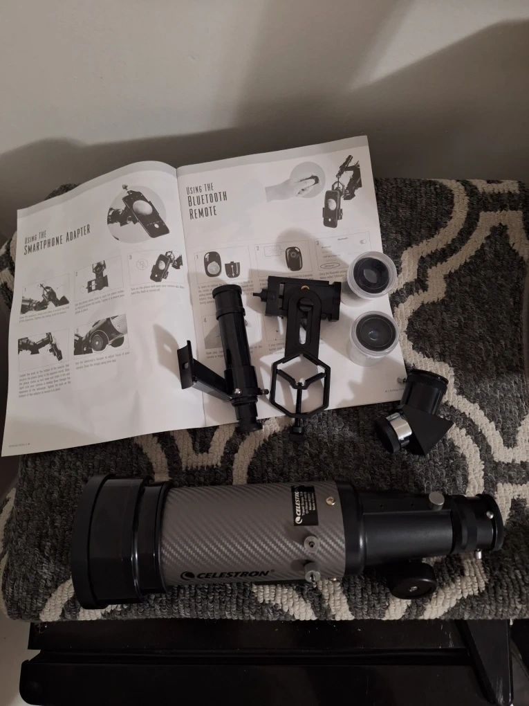 Selling a Celestron Travel Scope 70 DX telescope! It comes with its original backpack, making it super easy to carry around. Also includes the instruction manual and all the components for the smartphone adapter and Bluetooth remote setup. Ready for some stargazing?