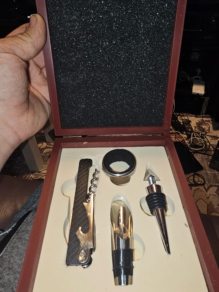 10Selling a complete Odzietzet wine tool set, complete with its original box. The set includes a corkscrew, bottle stopper, wine pourer, and drip ring. Perfect for any wine enthusiast!