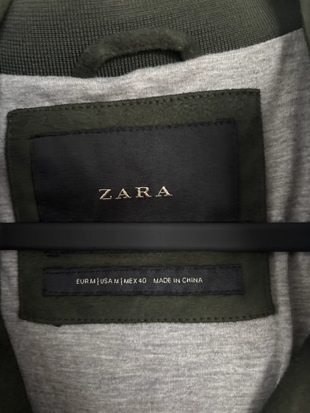 Selling a Zara jacket in olive green! It's a size M and has a suede-like texture. It has a zip-up front and a hood, perfect for layering.