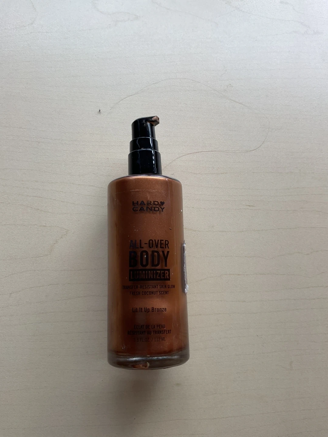 Selling a Hardy Candy All-Over Body Luminizer in Lit It Up Bronze! It has a fresh coconut scent and a transfer-resistant skin glow. The bottle contains 3.8 fl oz / 112 mL