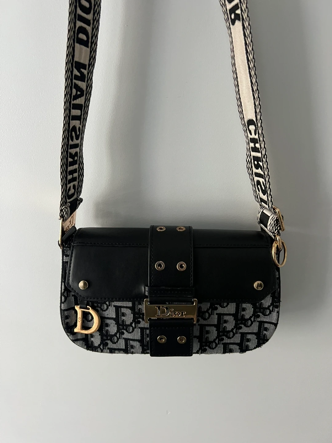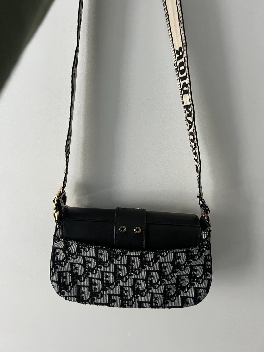 Selling a Christian Dior Saddle Bag in black. It's in great condition and features the iconic Dior logo on the strap and the front of the bag. The interior is lined with a patterned fabric and has a zip closure. Perfect for adding a touch of luxury to any outfit!