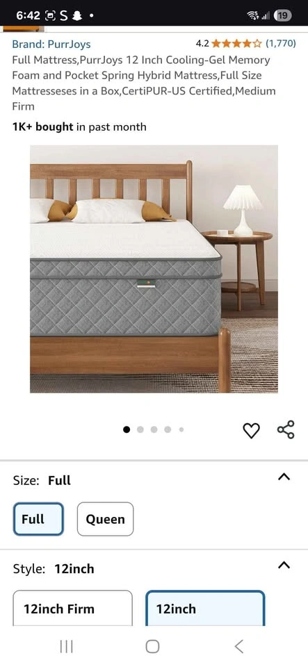 5Full Mattress, PurrJoys 12 Inch Cooling-Gel Memory Foam and Pocket Spring Hybrid Mattress, Full Size Mattresseses in a Box, CertiPUR-US Certified, Medium Firm. On Amazon for $289 plus tax. Bought it, however got something better. I need to get it out of here.