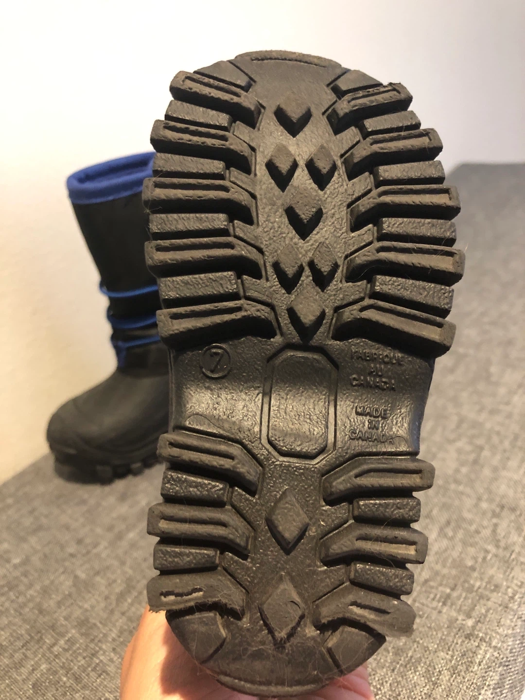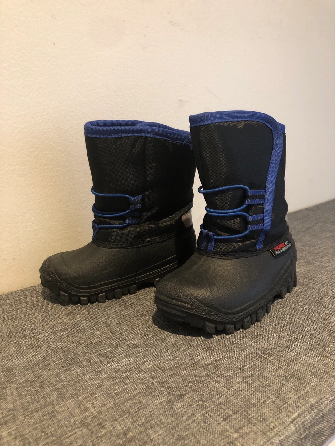 Selling a pair of kids' winter boots in size 7. They're black with blue accents, and have a waterproof sole! Perfect for keeping little feet warm and dry during the winter months.