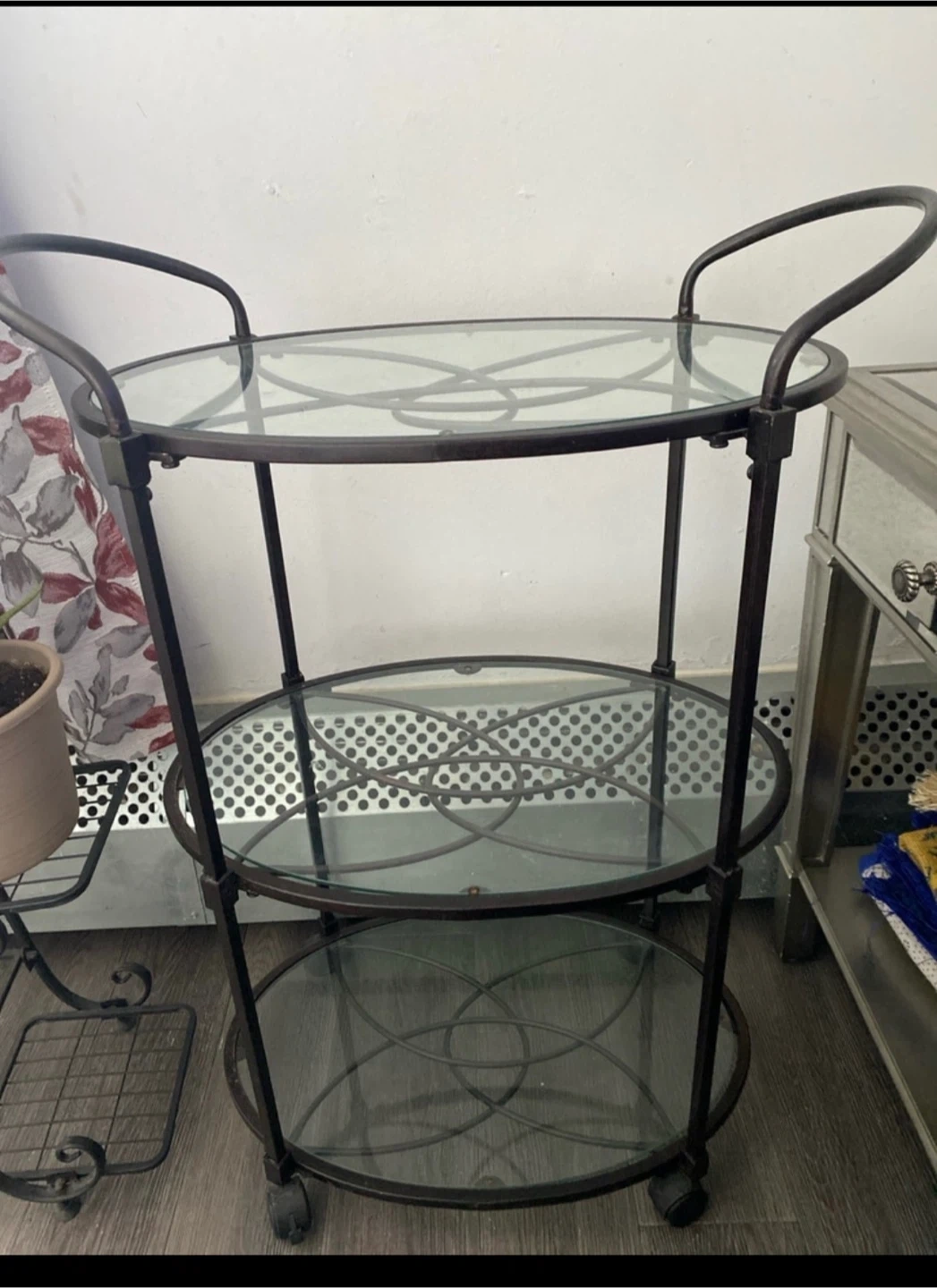 Selling a stylish rolling bar cart with a metal frame and glass shelves. It's perfect for adding a touch of elegance to your home. The cart has multiple tiers, providing ample space for drinks and accessories. It's in great condition and ready for a new home